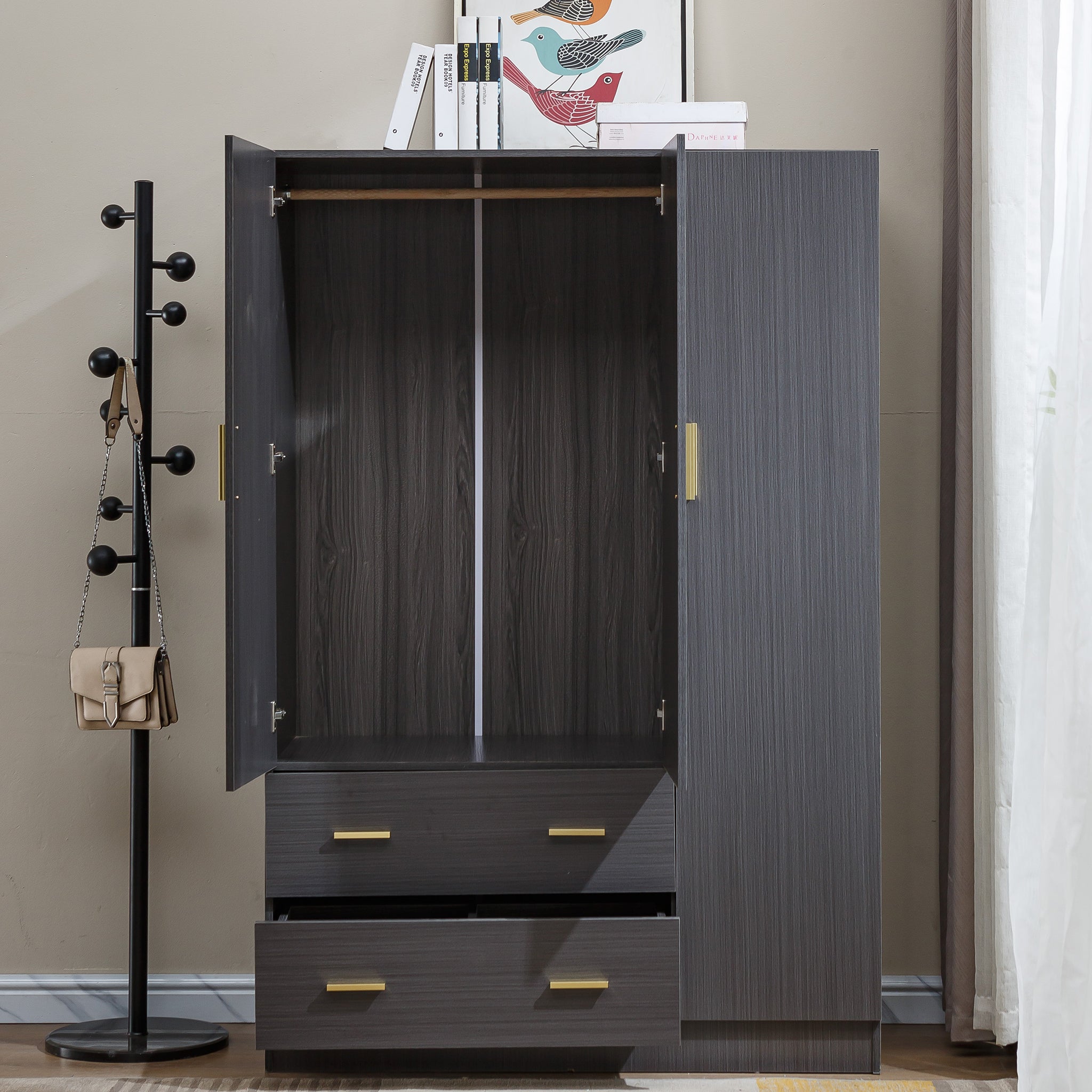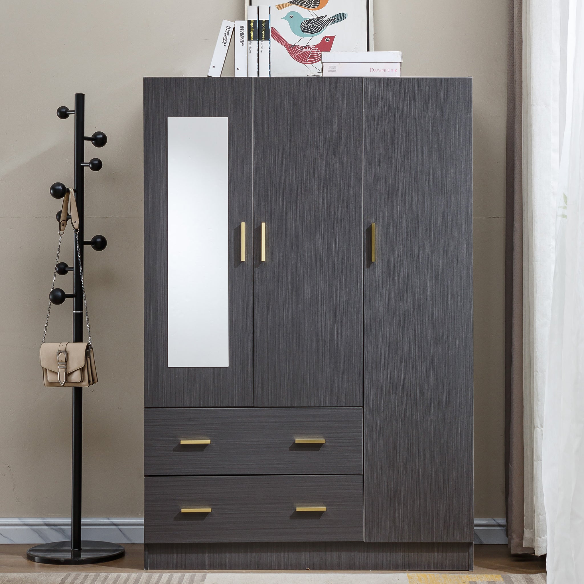 - High Quality: Made of high grade durable MDF board with the smooth surface, easy to maintain and keep clean. Gold metal handles give the wardrobe modern touch but still keeping it nice and simple. The mirror which can help you try on clothes and show your figure at a glance.