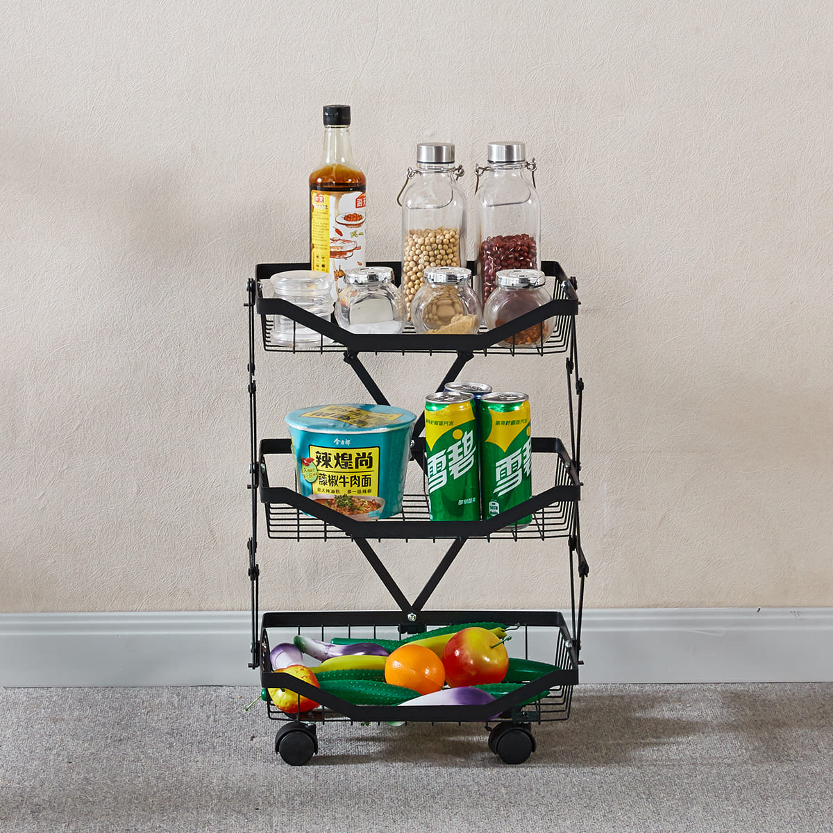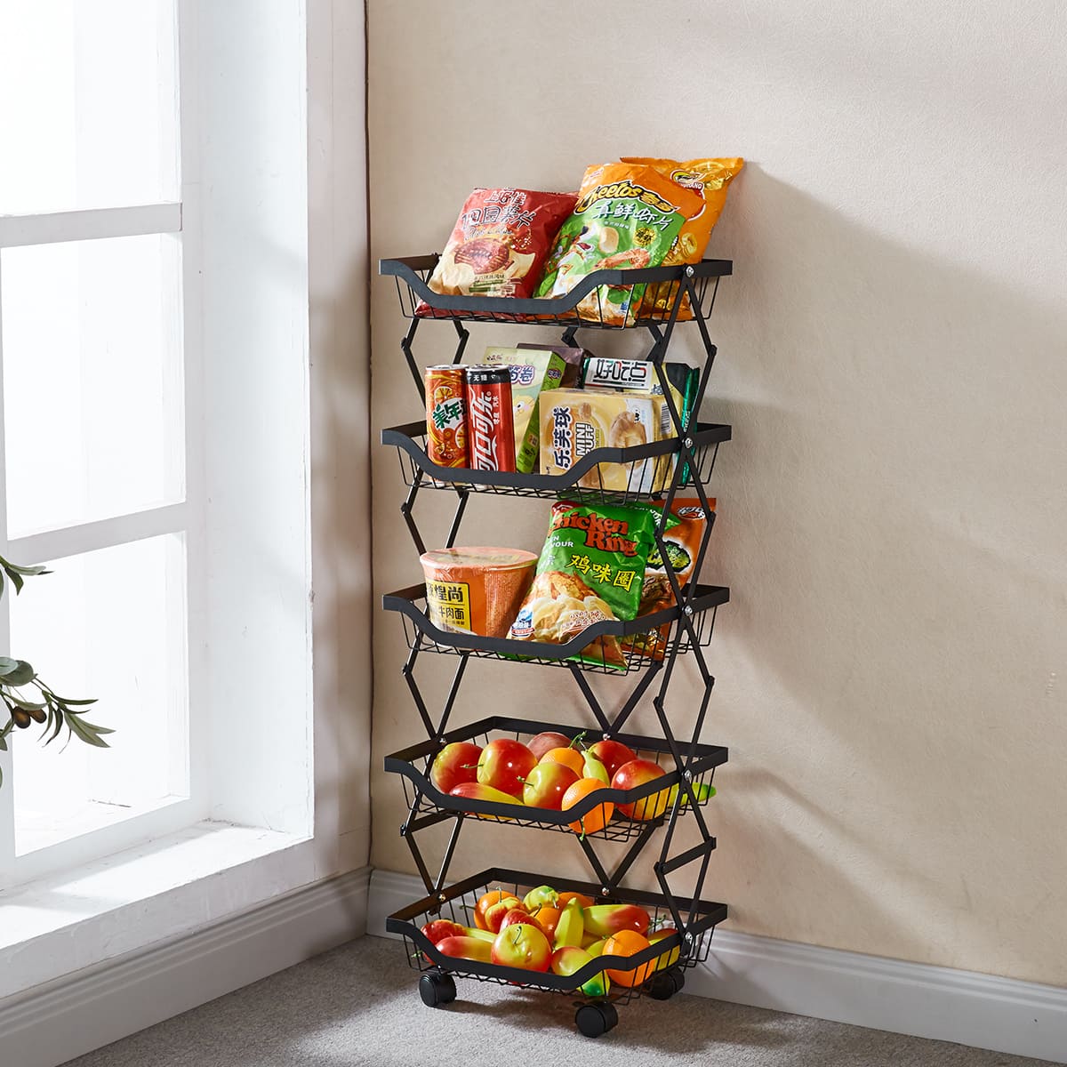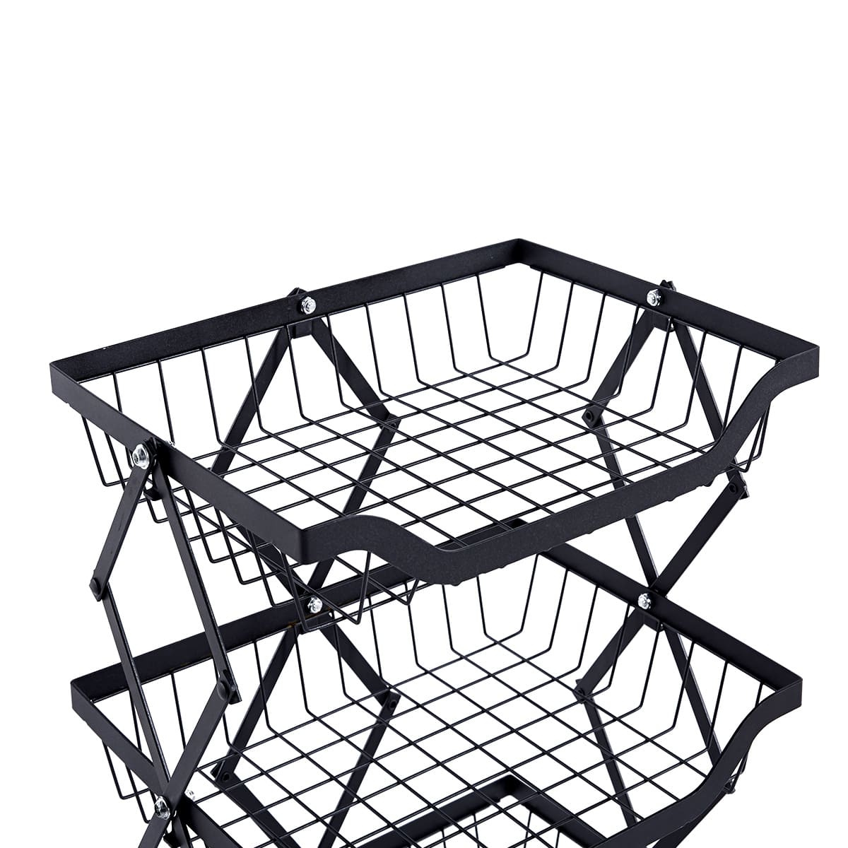 The Collapsible Fruit Cart comes with 4 baskets designed to provide sufficient space for your daily storage; The edges of the basket are heightened and thickened to ensure that your items remain secure when the cart is moving, and mesh holes allow airflow to prevent odour.