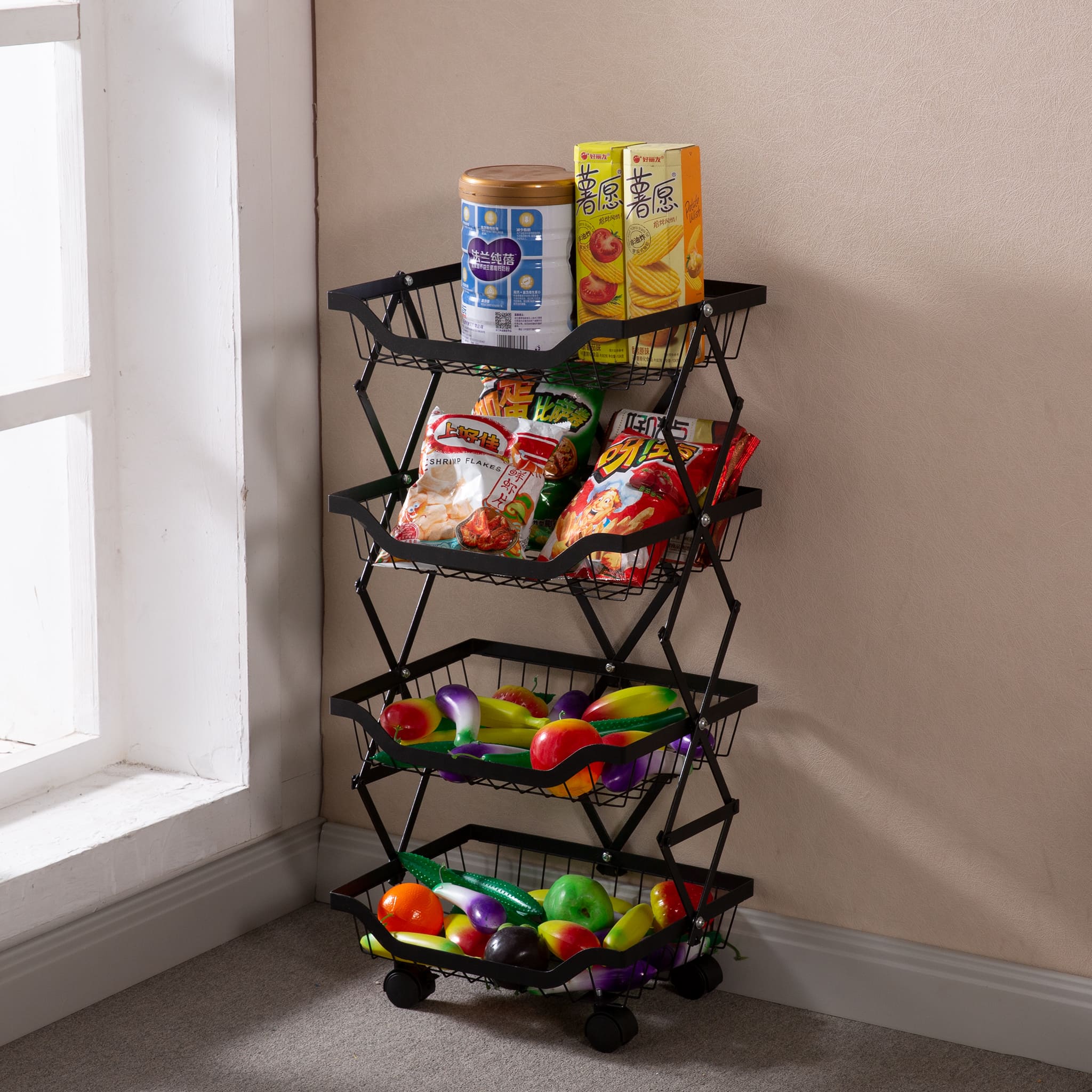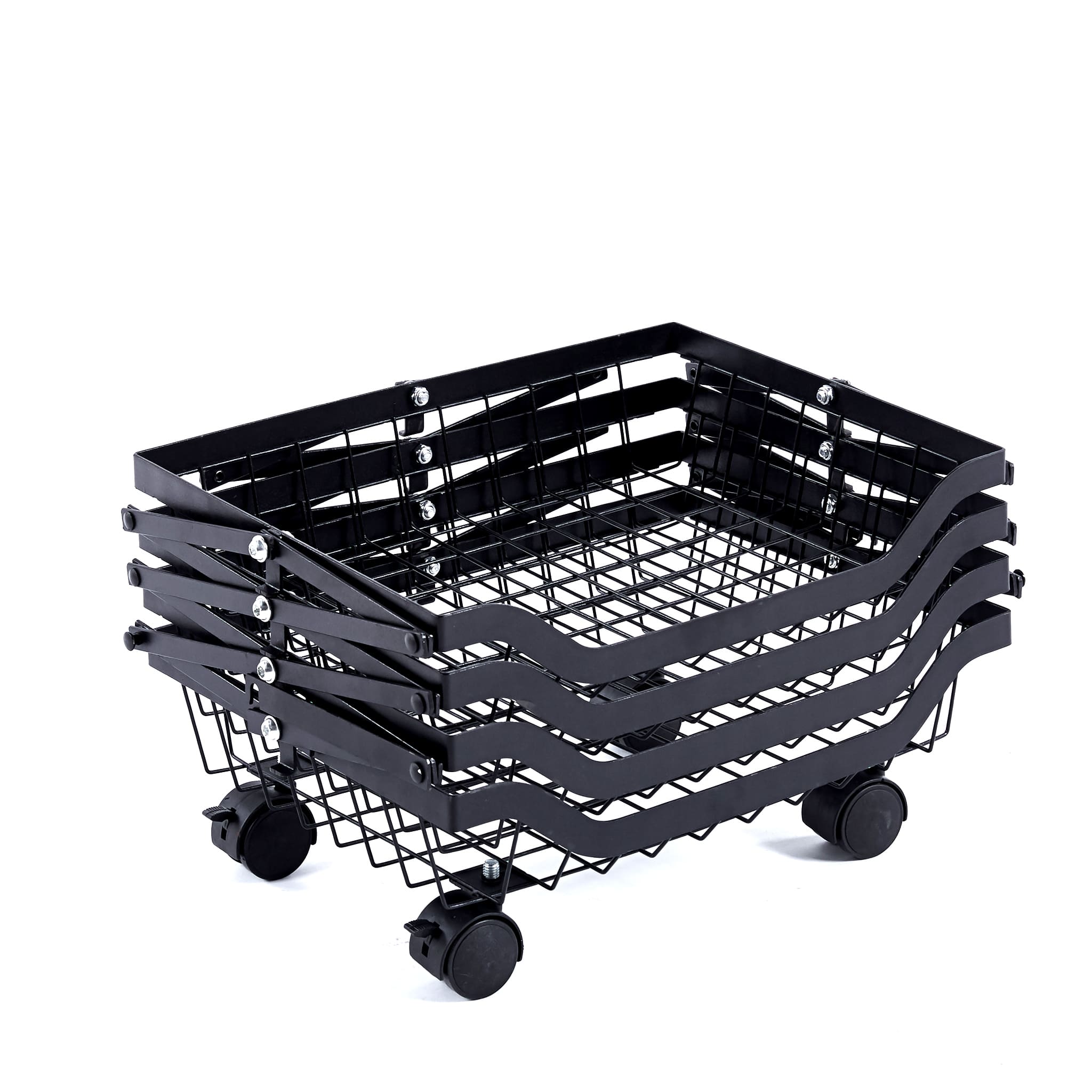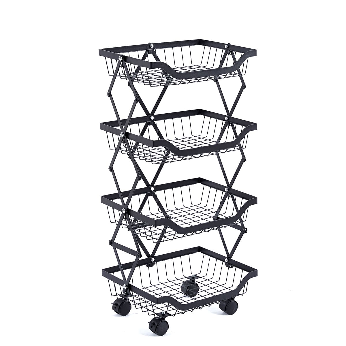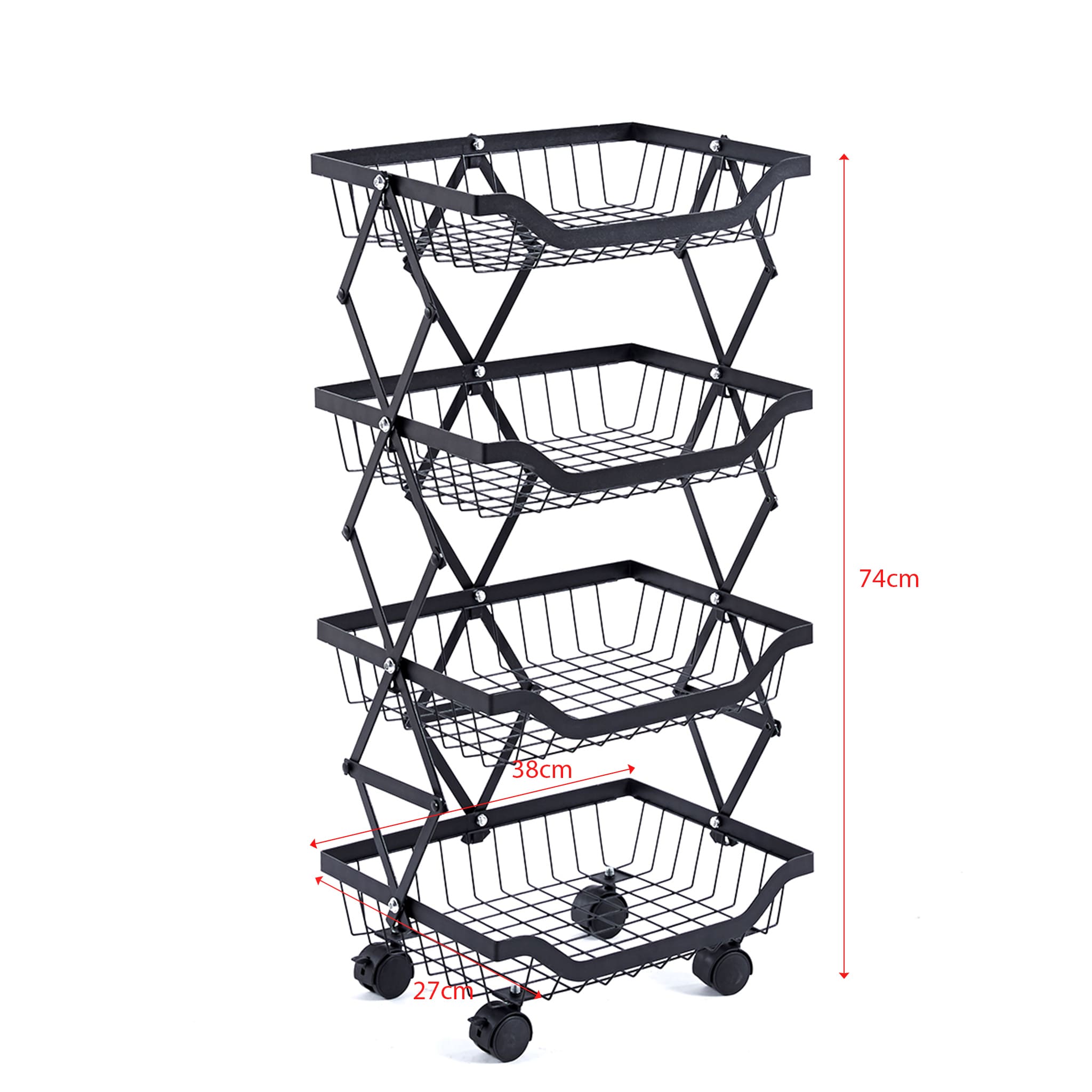 Maximize your storage with the Collapsible Fruit Cart, a space-saving solution with 4 deep baskets and a sturdy iron frame. Its lockable, 360-degree wheels ensure smooth mobility and stability, perfect for any home or commercial setting. Durable, anti-corrosion, and easy to store, it's ideal for organizing fruits and more.