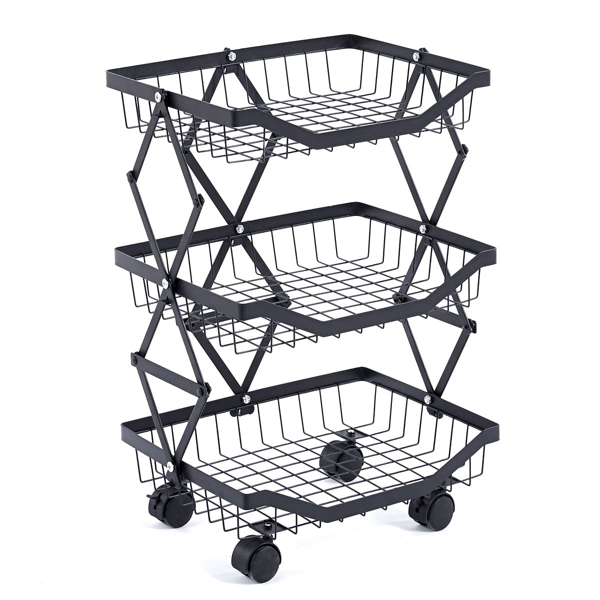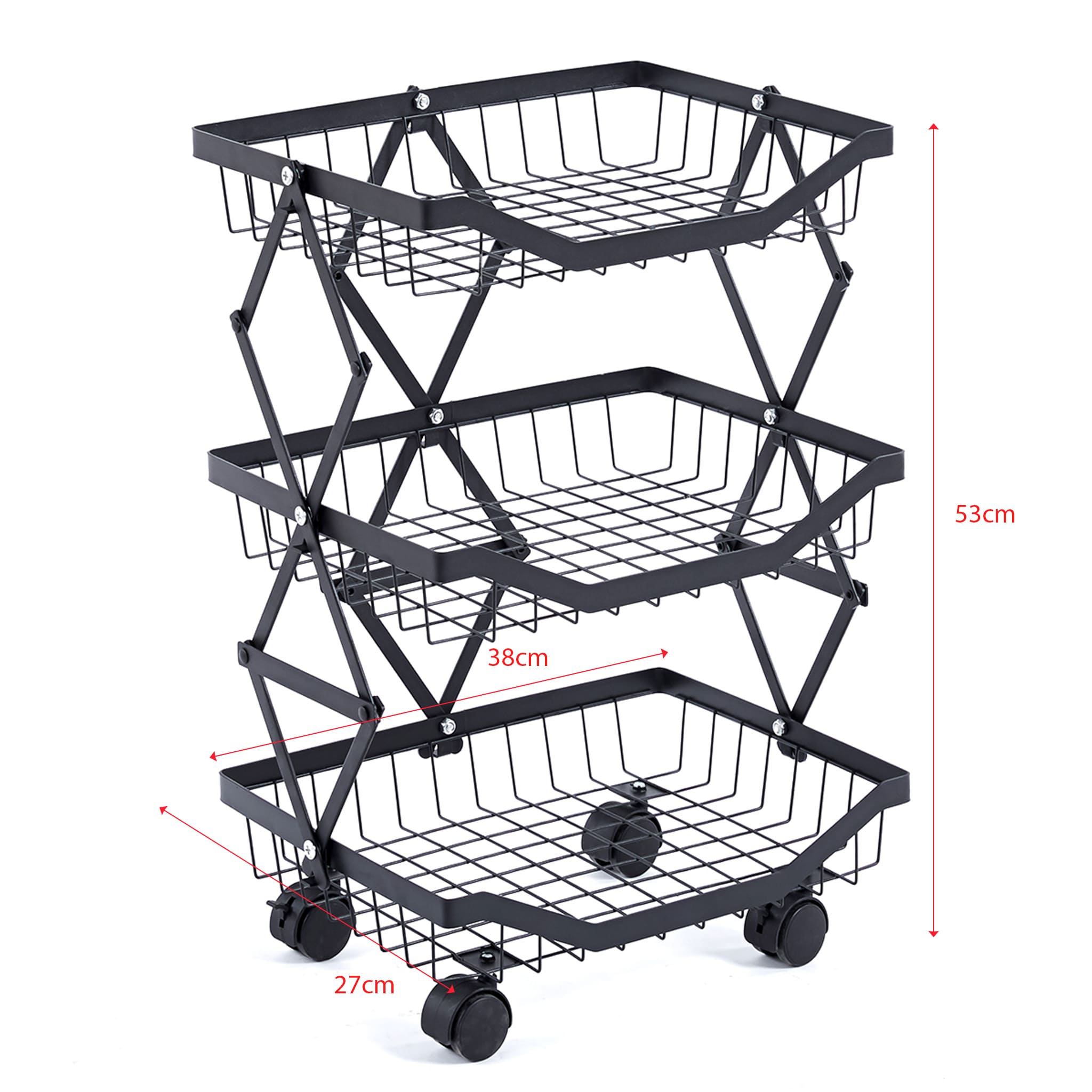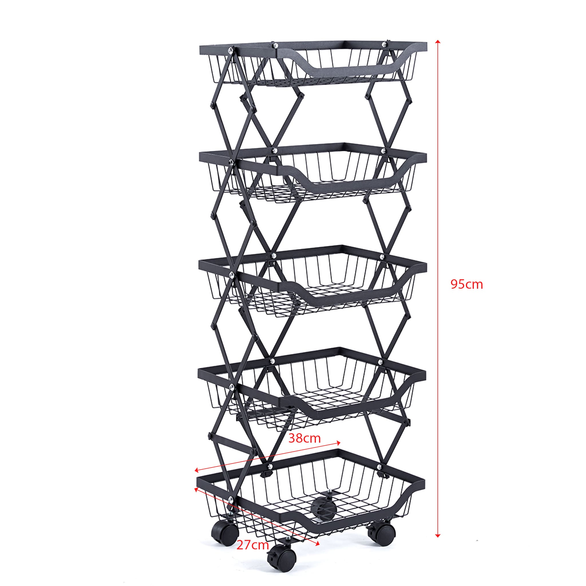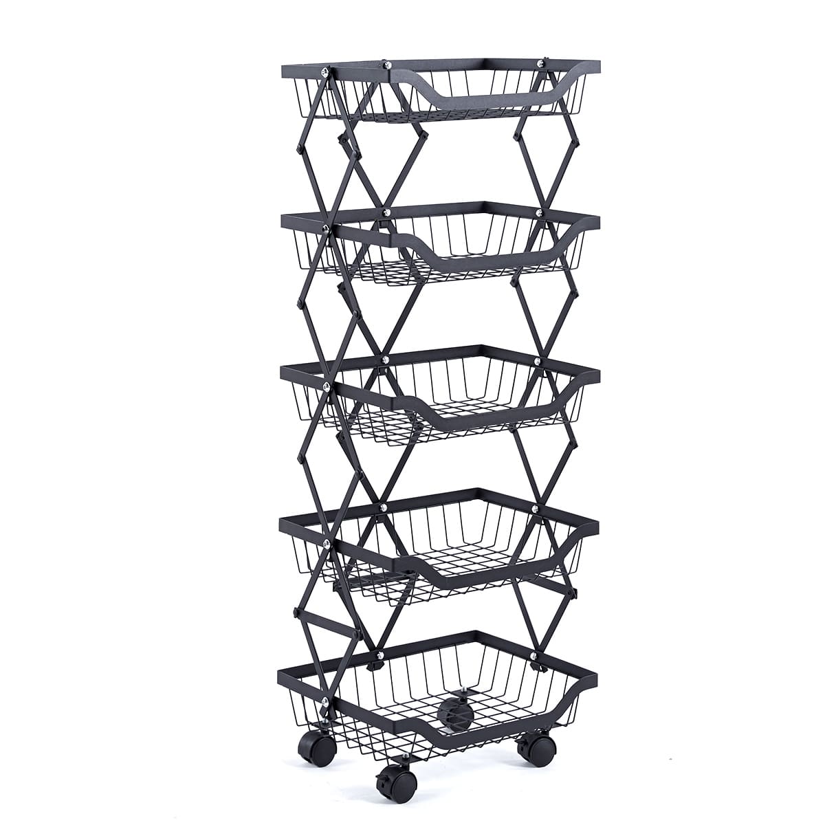 Maximize your storage with the Collapsible Fruit Cart, a space-saving solution with 4 deep baskets and a sturdy iron frame. Its lockable, 360-degree wheels ensure smooth mobility and stability, perfect for any home or commercial setting. Durable, anti-corrosion, and easy to store, it's ideal for organizing fruits and more.