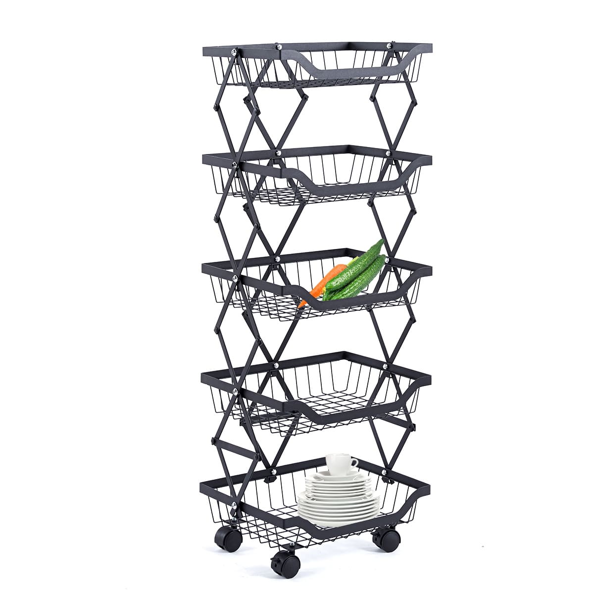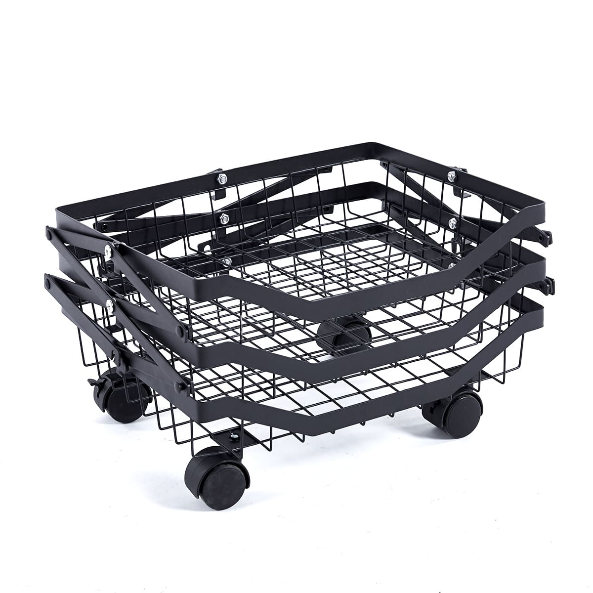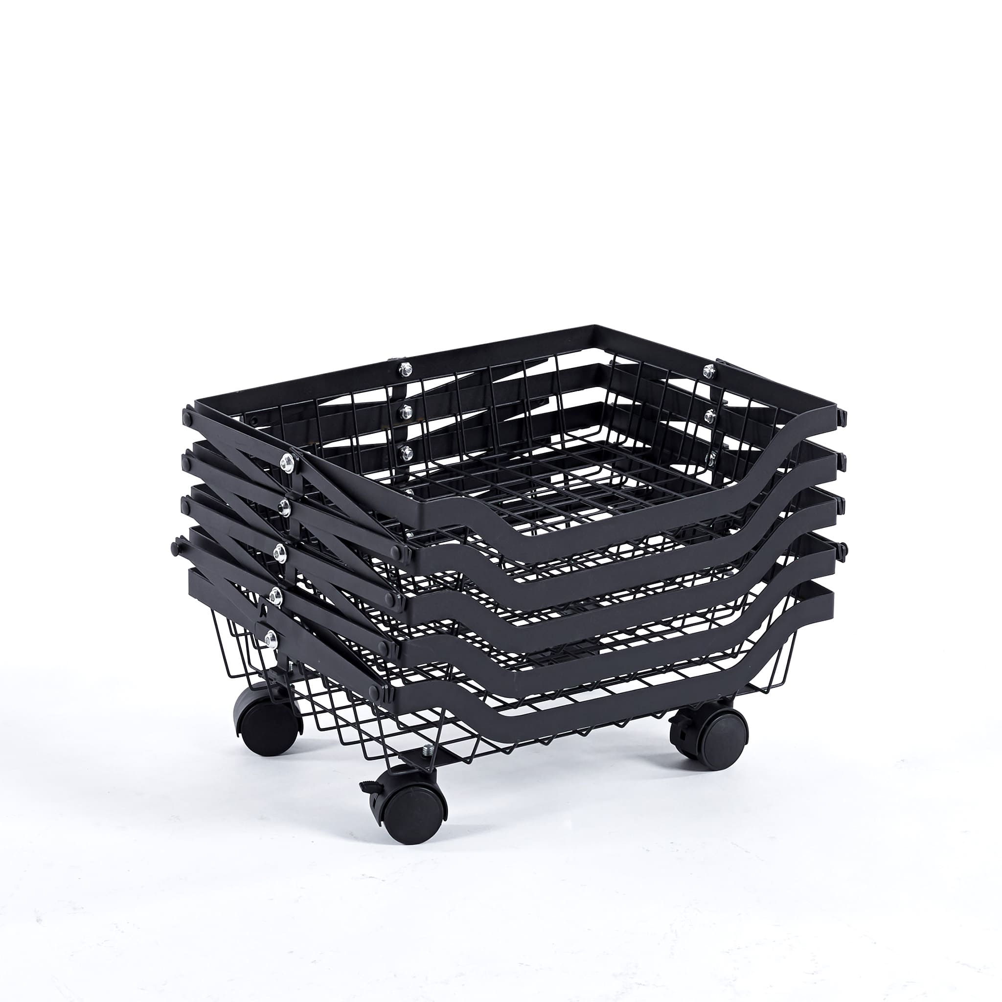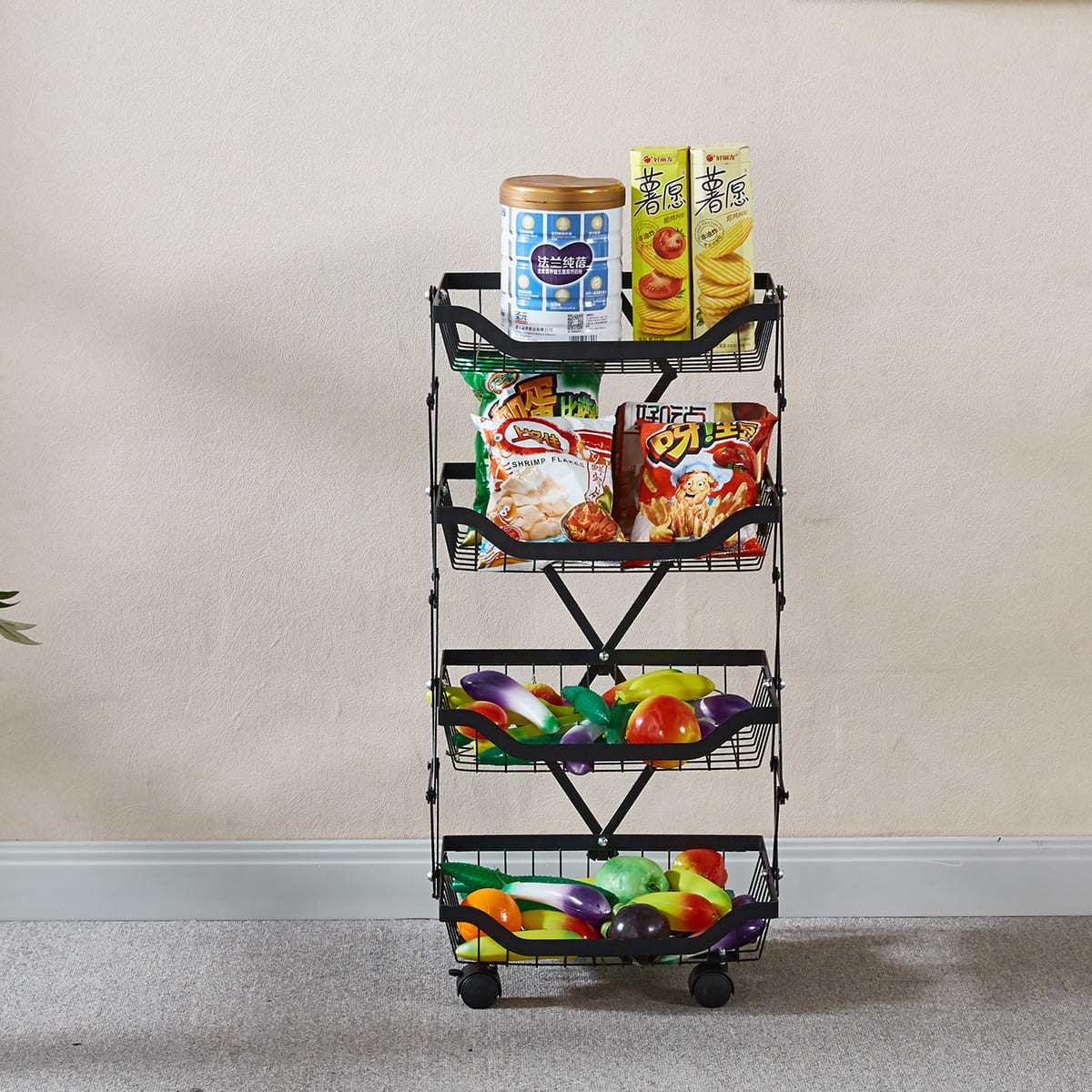 Maximize your storage with the Collapsible Fruit Cart, a space-saving solution with 4 deep baskets and a sturdy iron frame. Its lockable, 360-degree wheels ensure smooth mobility and stability, perfect for any home or commercial setting. Durable, anti-corrosion, and easy to store, it's ideal for organizing fruits and more.