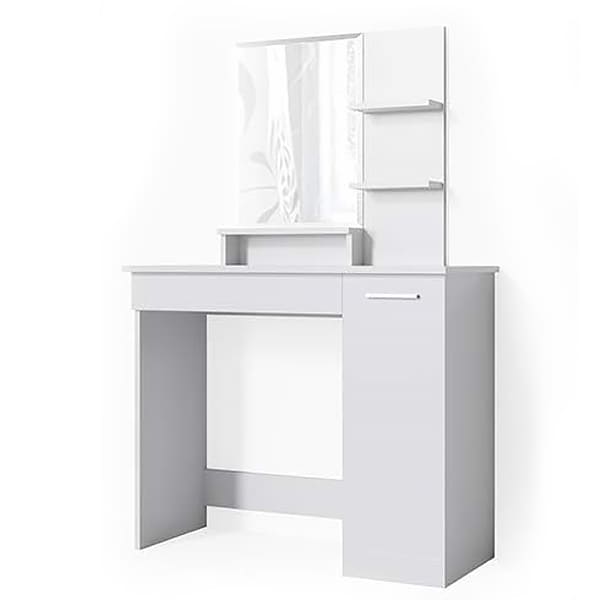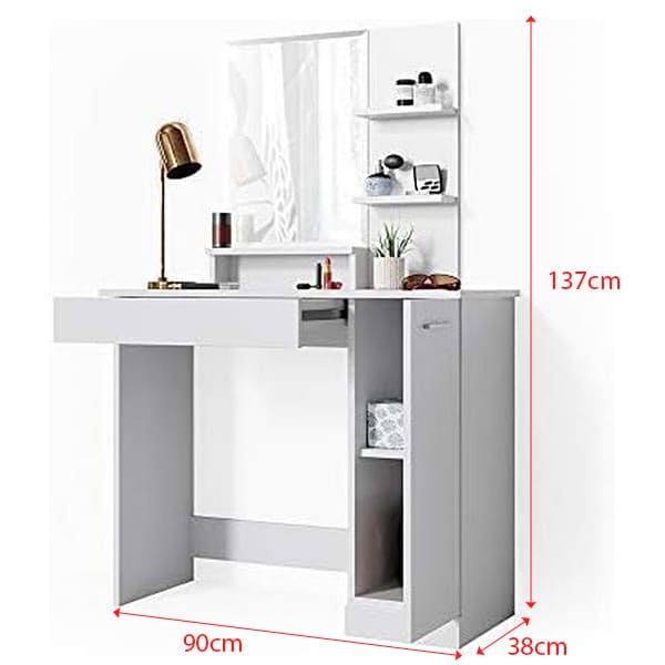 Maximize your beauty routine with the SHI13SA Dressing Table Cabinet, featuring a high-definition makeup mirror. Crafted from eco-friendly MDF, this table offers ample storage with a shelf, drawer, and cabinet. Its versatile design allows for left or right positioning, ensuring a perfect fit for any space. Dimensions: 90x37x138cm.