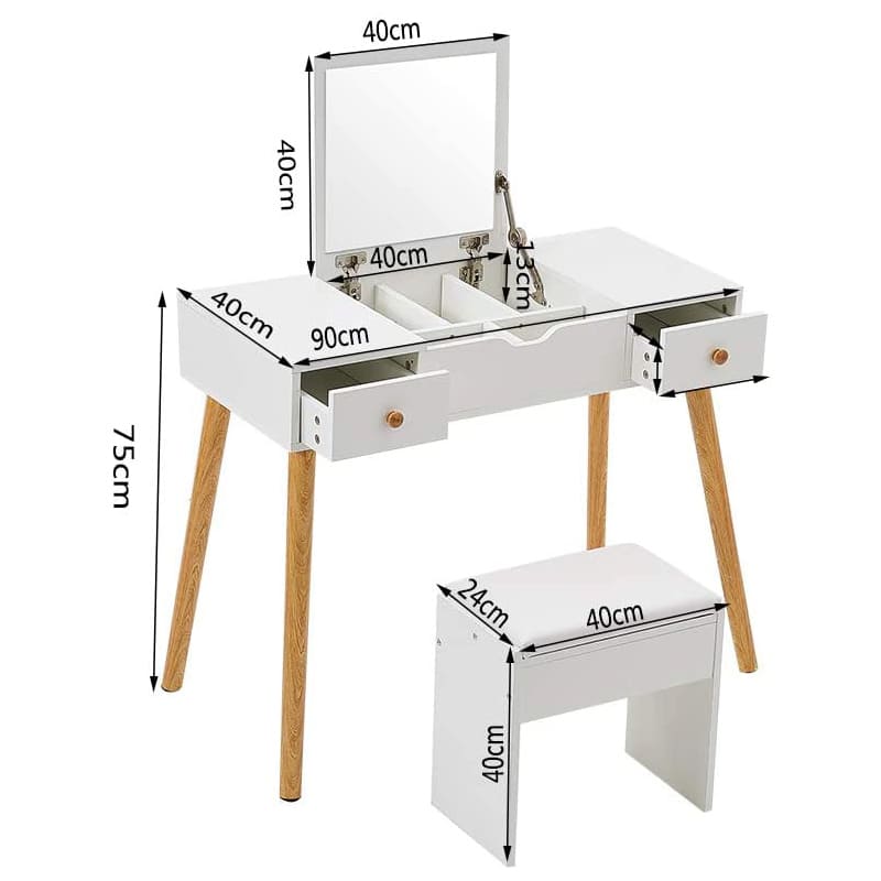 - High Quality Material: The dressing table is made of grade environment-friendly MDF board, scratch-resistant and moisture-resistant. The mirror is high-definition mercury mirror.