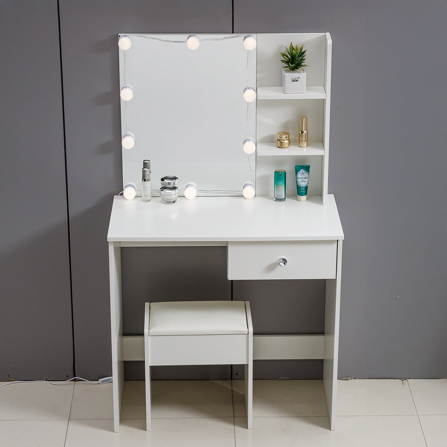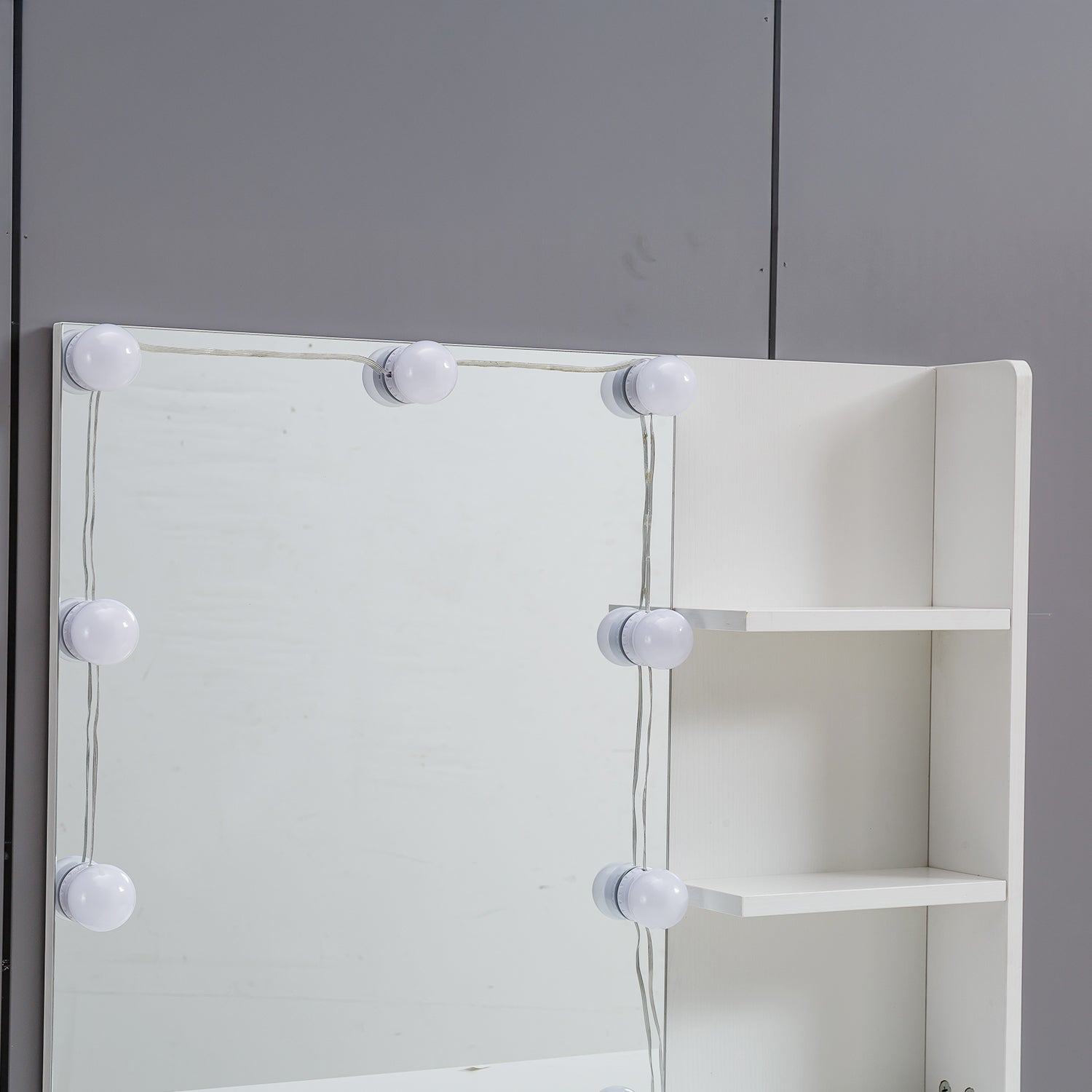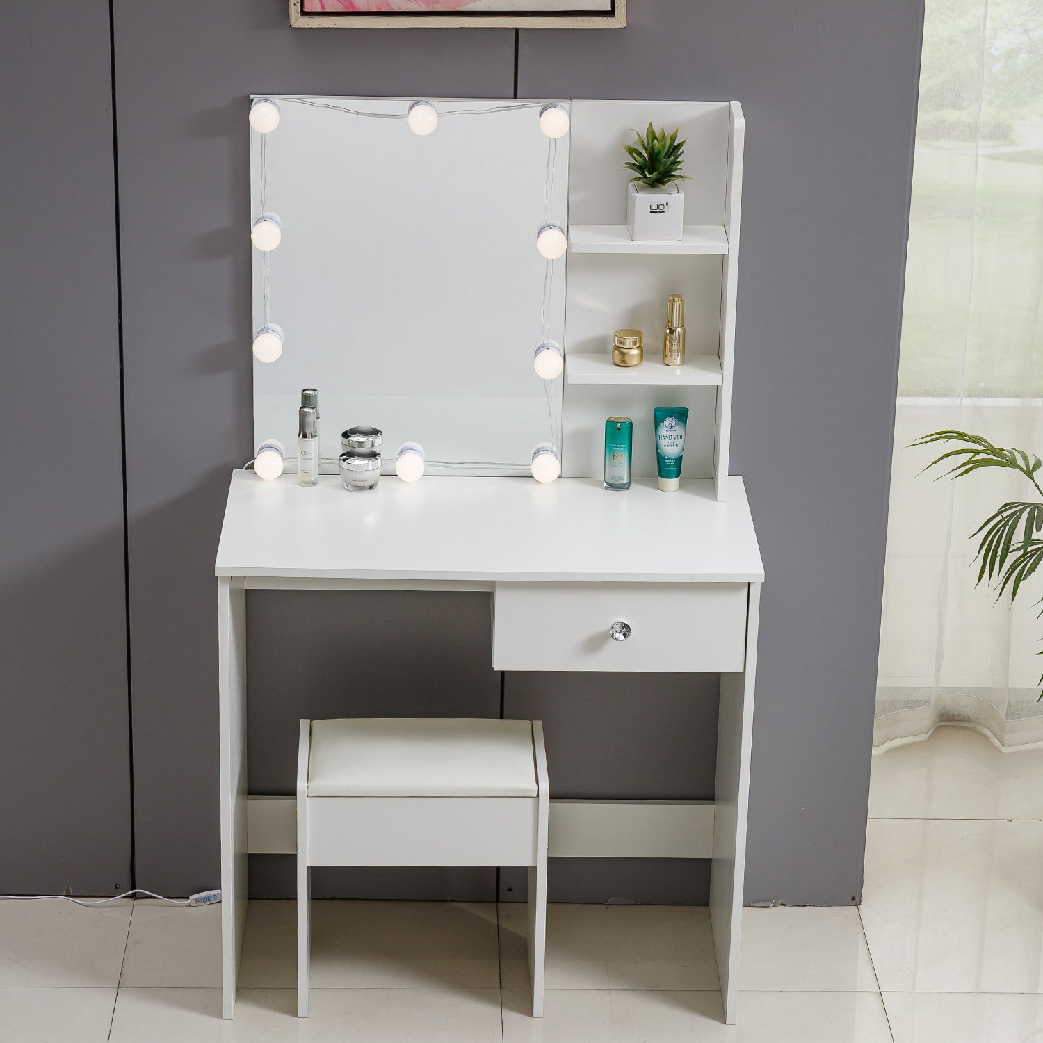 - 10 LED Lights: This dressing table features 10 LED bulbs around the mirror, giving you the makeup environment of Hollywood dressing rooms. You'll get all you need to set the perfect mood of your beauty station and apply makeup, grooming and hairstyling and more. Upholstered stools make it more comfortable for you to sit on.