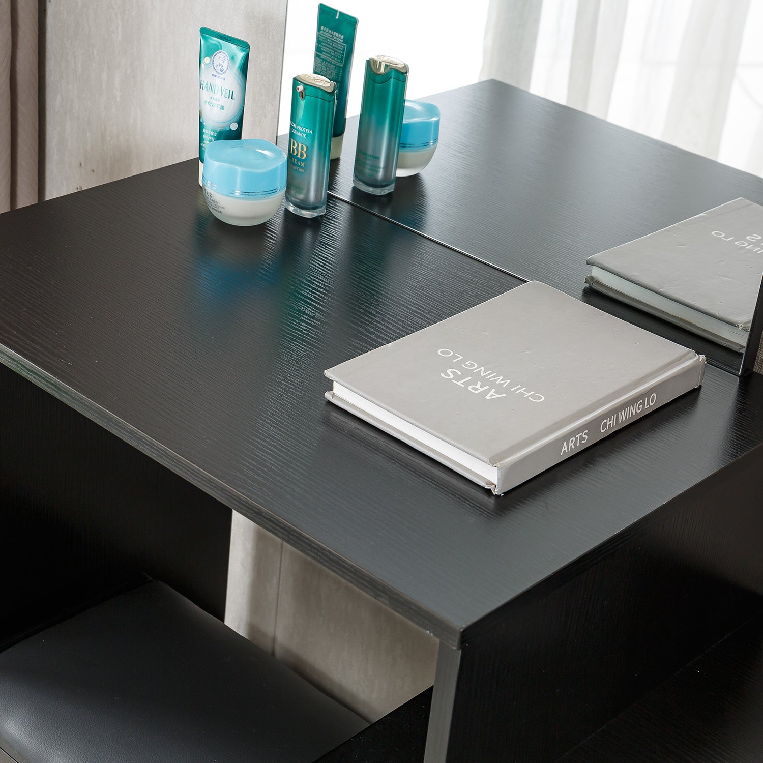 Upgrade your room with this contemporary Dressing Table with Mirror DR-12. This sturdy furniture piece, crafted from high-quality particle board, features ample storage with 3 drawers and 2 tabletops at varying heights, making it ideal for organizing cosmetics, jewelry, and accessories. Its sleek black surface design and large mirror offer a modern aesthetic, perfect for a bedroom vanity. Paired with a PU leather-upholstered stool, it ensures comfort and durability. Easy to assemble and maintain, this dressing table combines functionality and style, making it a thoughtful gift for women or girls on special occasions.