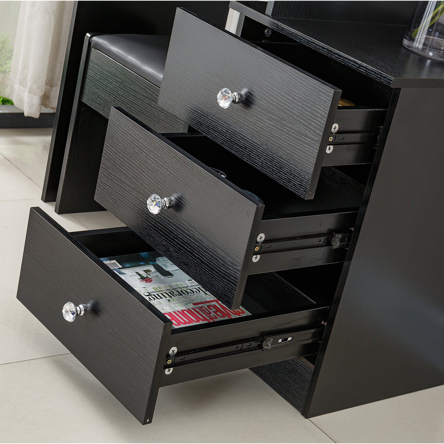 Enhance your bedroom with the Black Dressing Table with Mirror Furniture, featuring durable particle board construction. This sleek furniture includes three drawers and two-tiered tabletops, perfect for organizing cosmetics and jewelry. Its modern design complements the large mirror and PU leather-upholstered stool. A thoughtful gift for women, offering style and functionality.