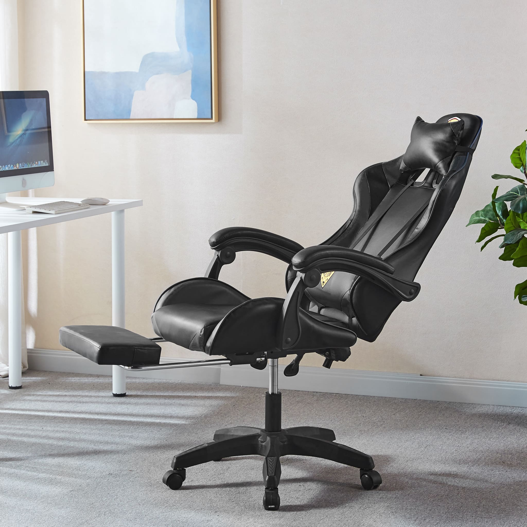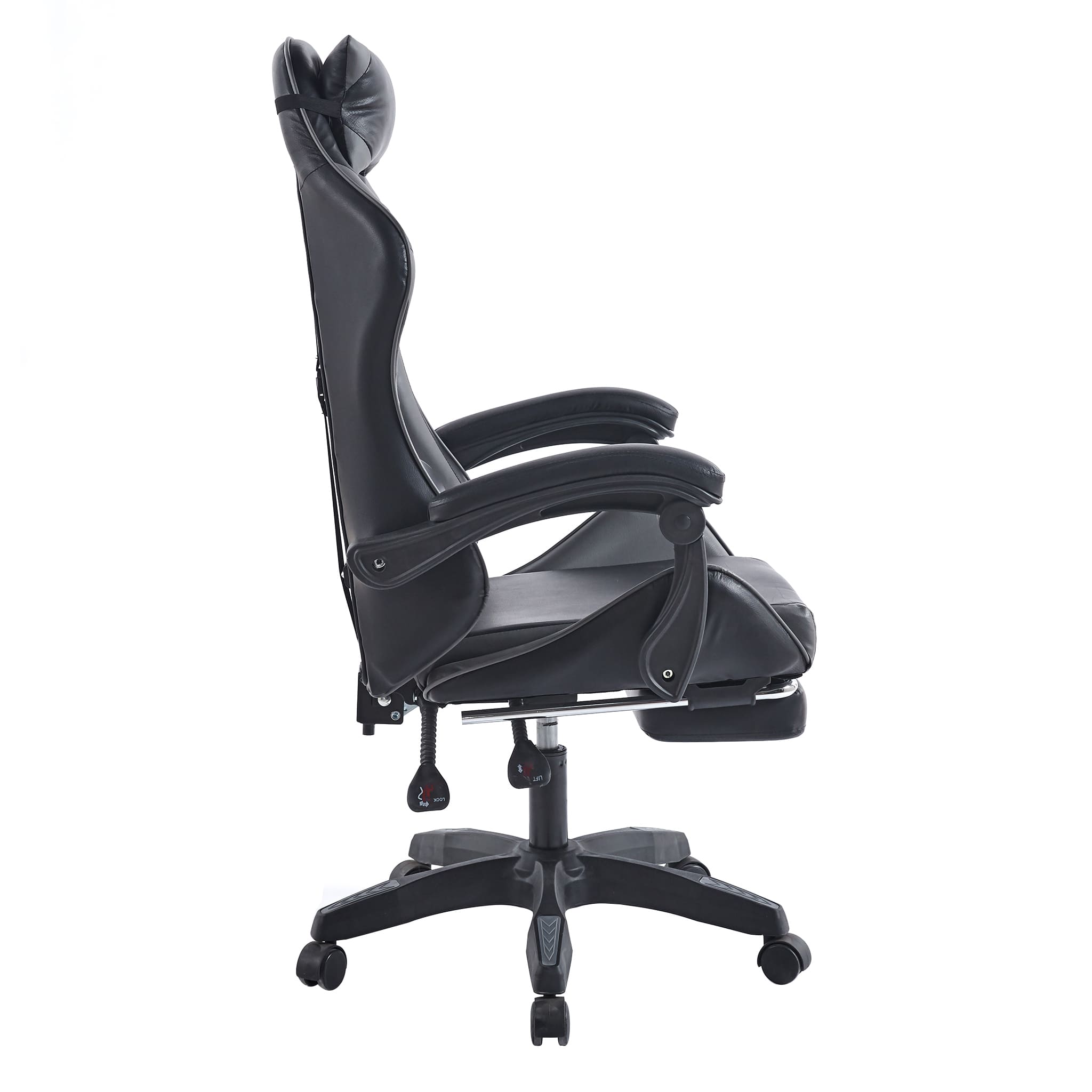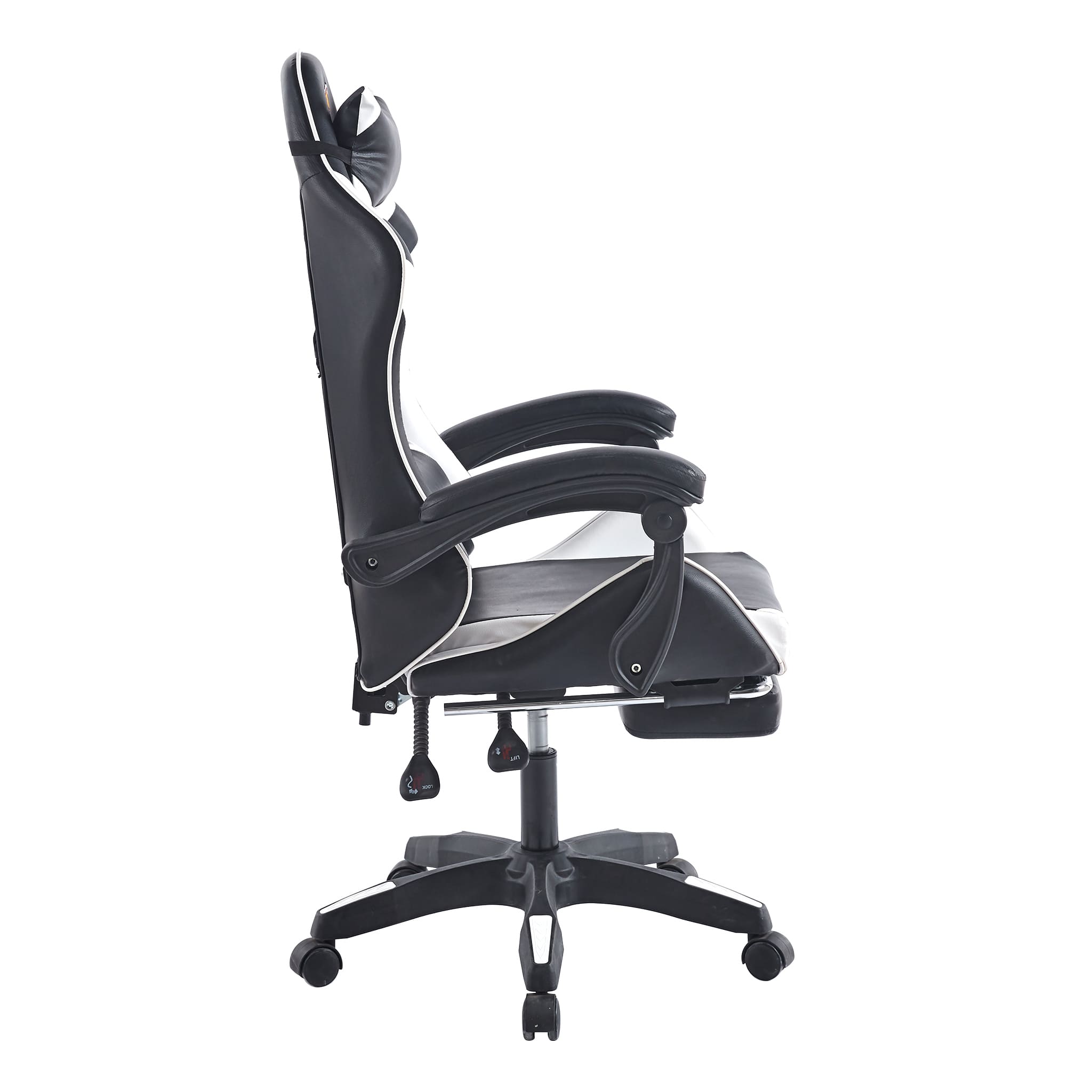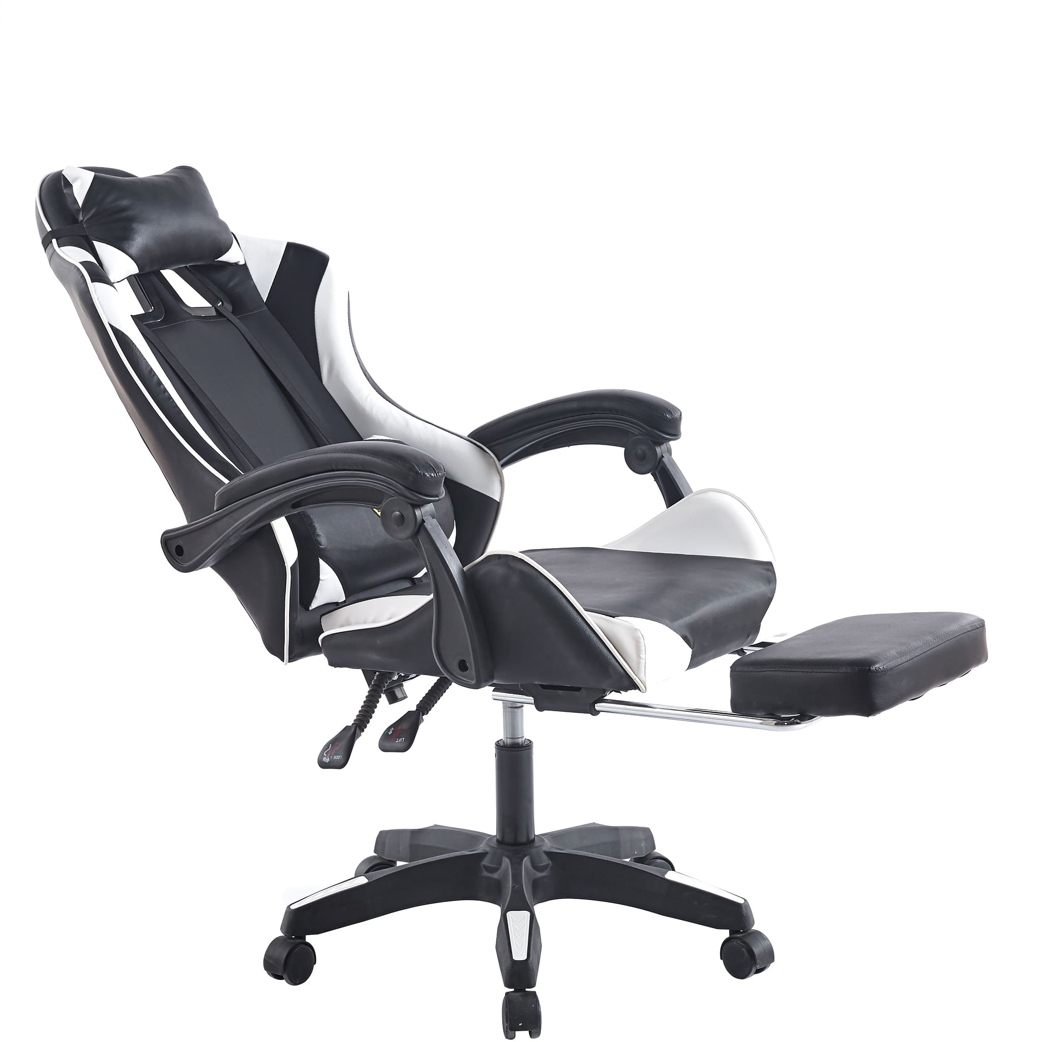 Make sure you're comfortable as you battle it out to be the best. This Gaming Chair /computer chair is made of high-quality PU leather and is designed for durability and comfort with a adjustable backrest and footrest, removable support cushions help to maintain body posture allowing for unlimited hours of gaming .The Full 360-degree swivel and a 180-degree backward tilt gives the user freedom to find optimal positioning. So, get ready to game in comfort and style.