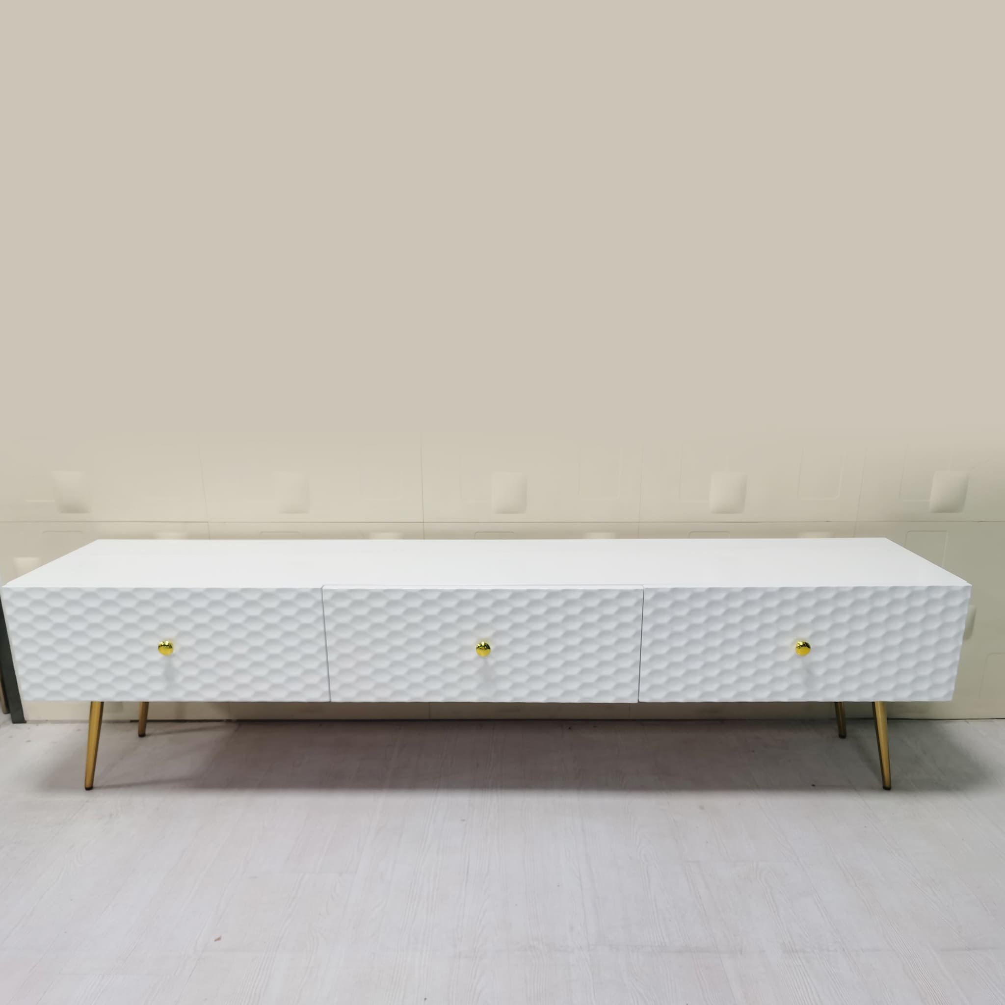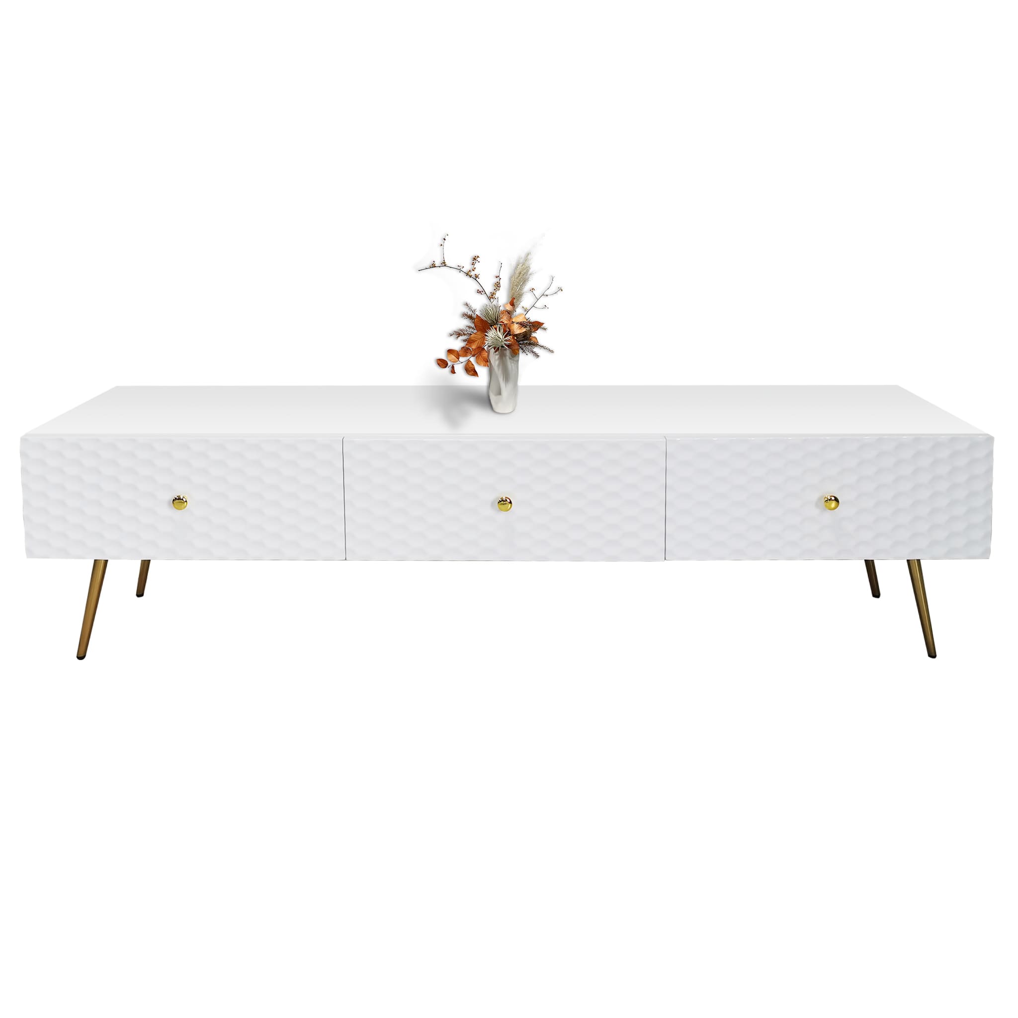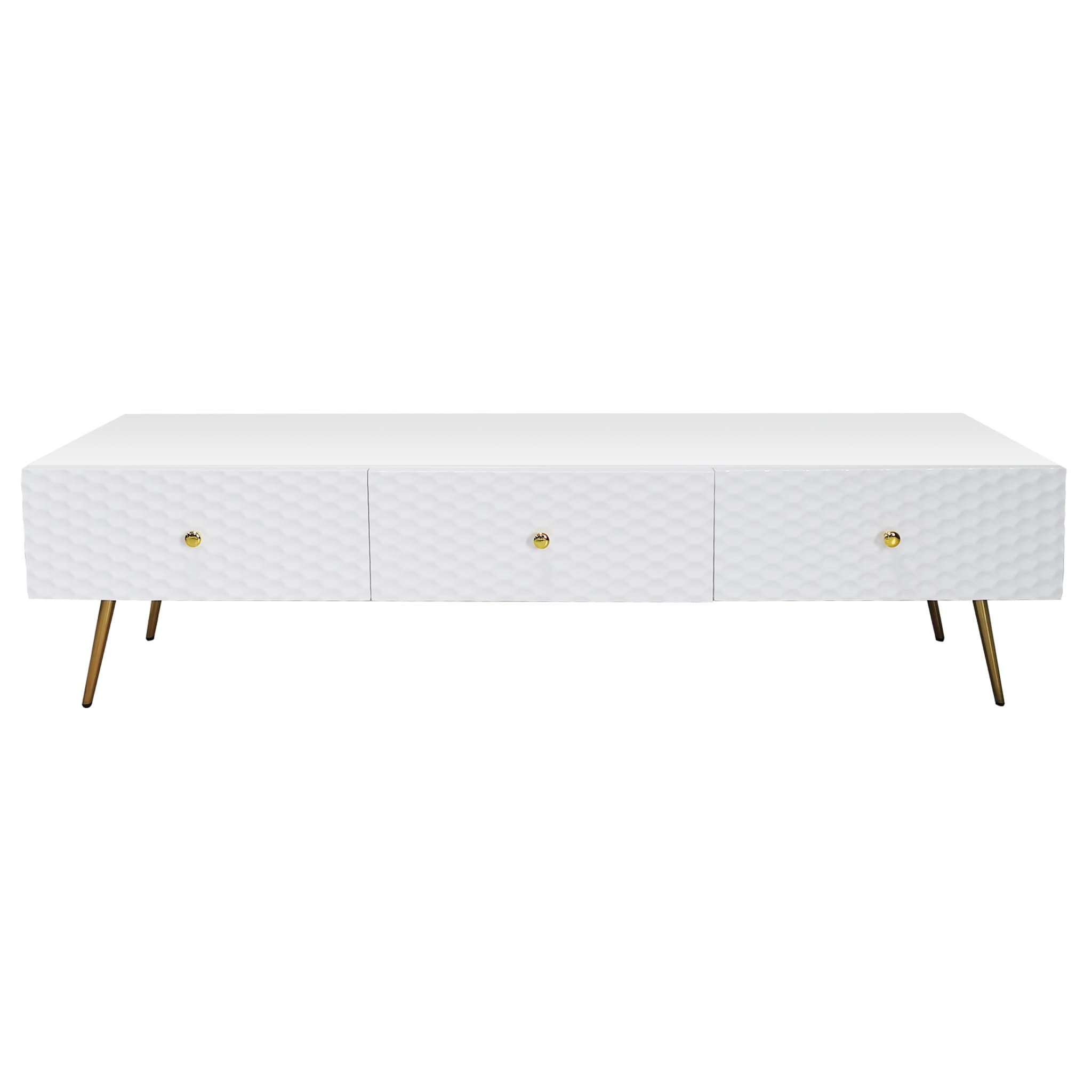 Anchor your entertainment ensemble with this TV stand, both chic and style. Designed with a rectangular silhouette with the lacquered wavy surface in the gold finish, this TV stand brings a contemporary fashionable taste with a chic appeal. 3 drawers storage space for DVD players, CDs, and other media accessory necessities. Two electrical outlet and cord holes are ideal to manage cords. Crafted from premium wood and stainless steel, it allows for a durable solution through frequent use. Perfect for your living room.