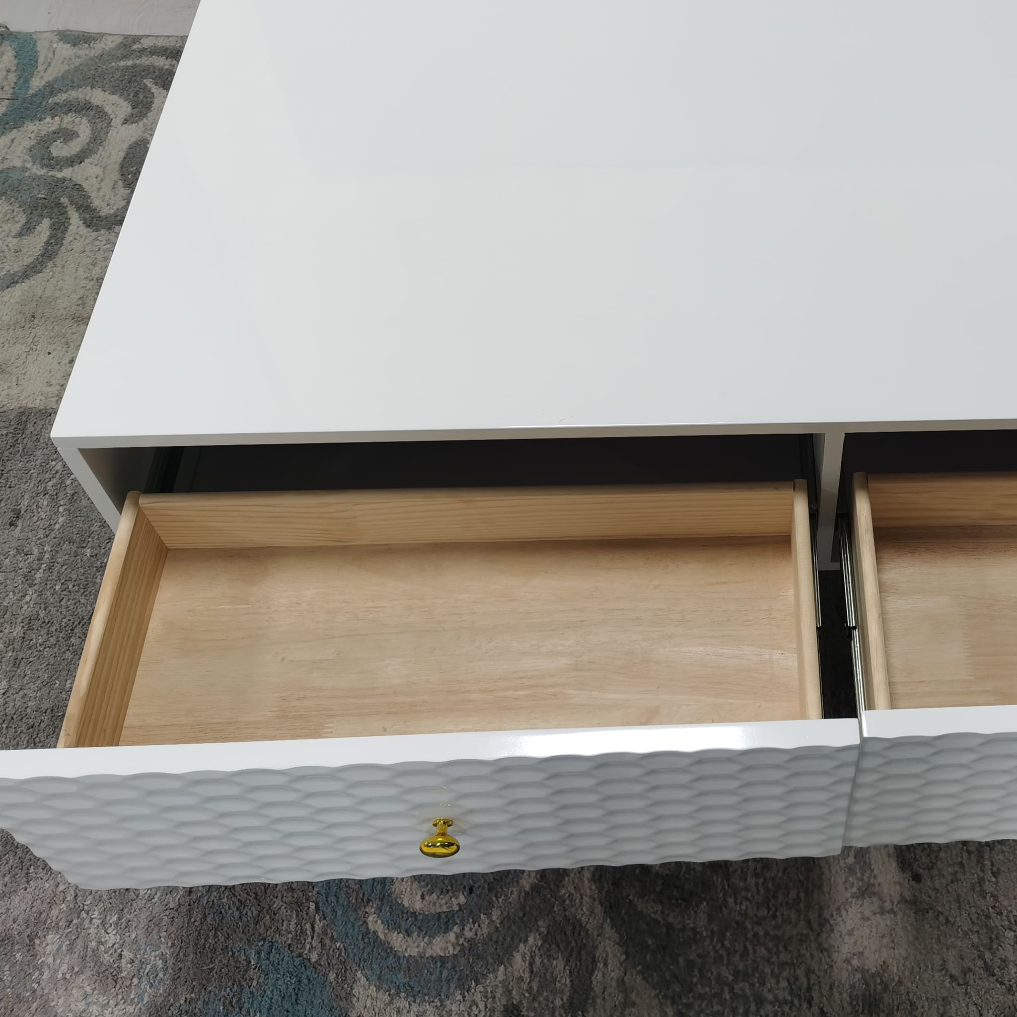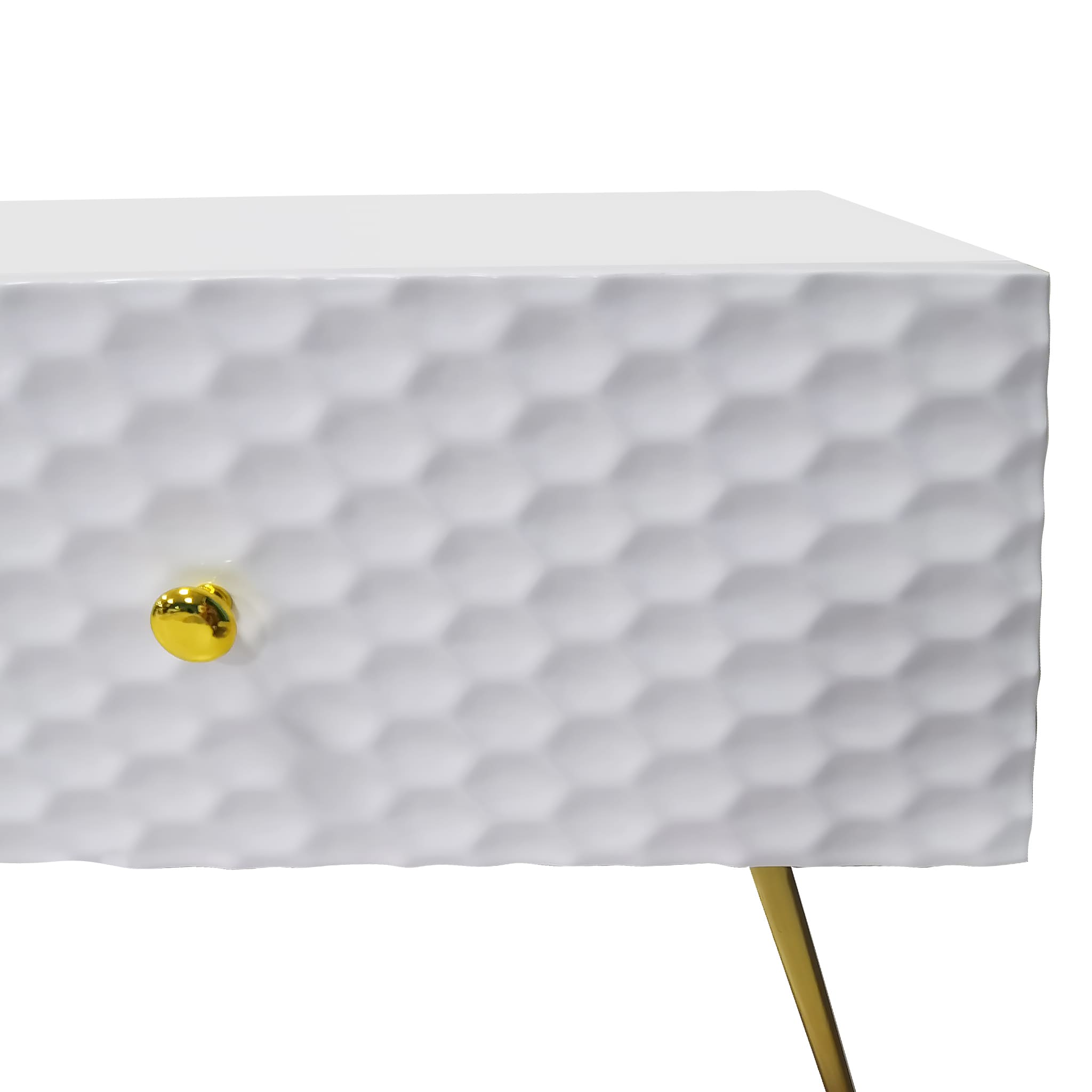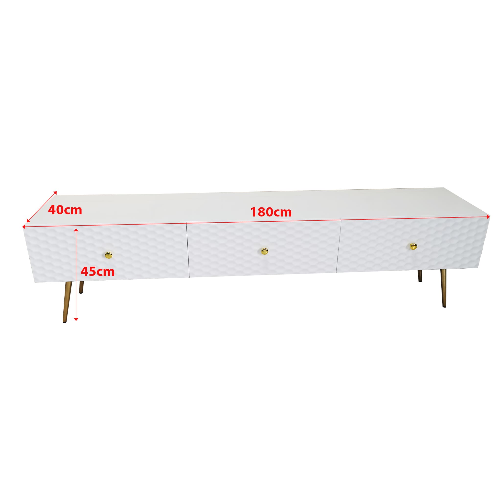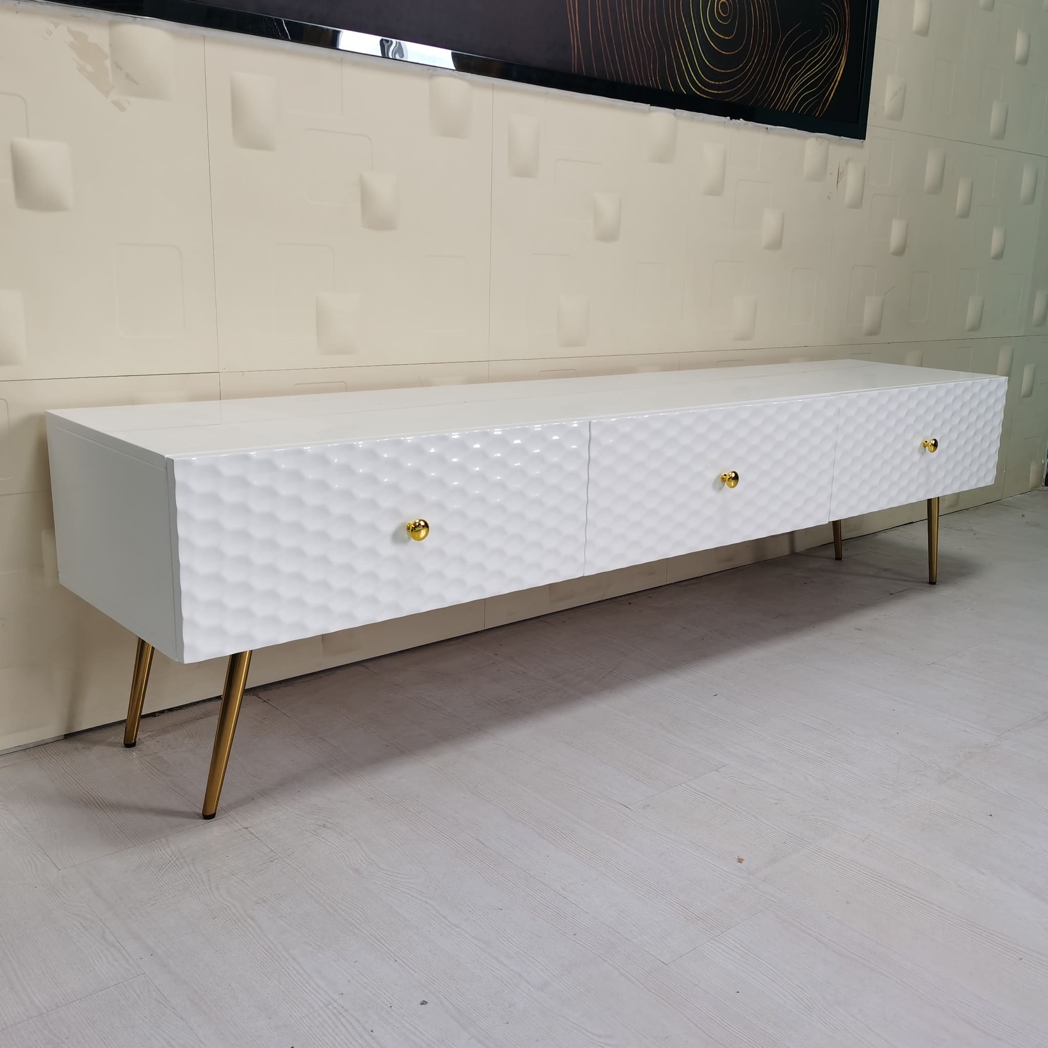 Anchor your entertainment ensemble with this TV stand, both chic and style. Designed with a rectangular silhouette with the lacquered wavy surface in the gold finish, this TV stand brings a contemporary fashionable taste with a chic appeal. 3 drawers storage space for DVD players, CDs, and other media accessory necessities. Two electrical outlet and cord holes are ideal to manage cords. Crafted from premium wood and stainless steel, it allows for a durable solution through frequent use. Perfect for your living room.