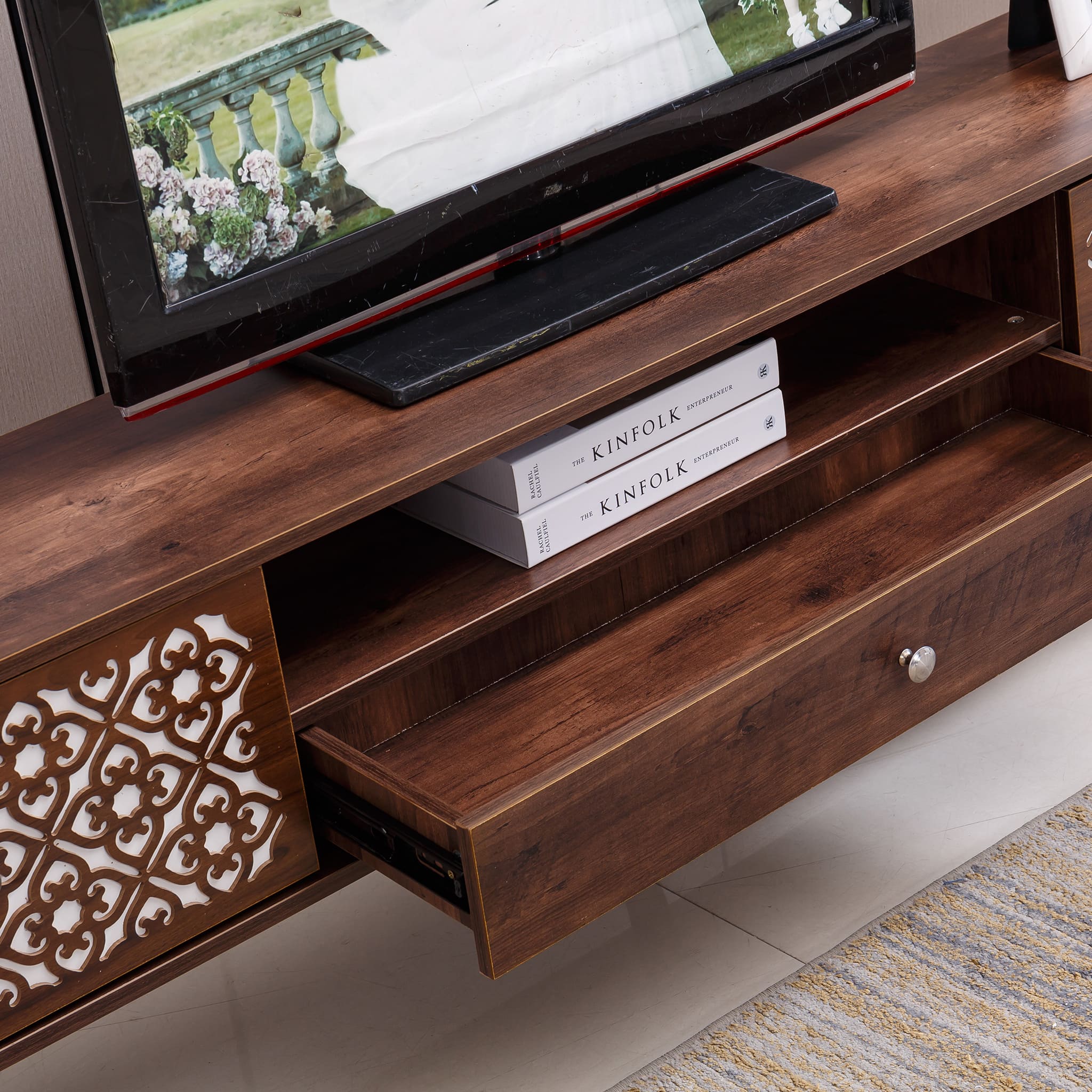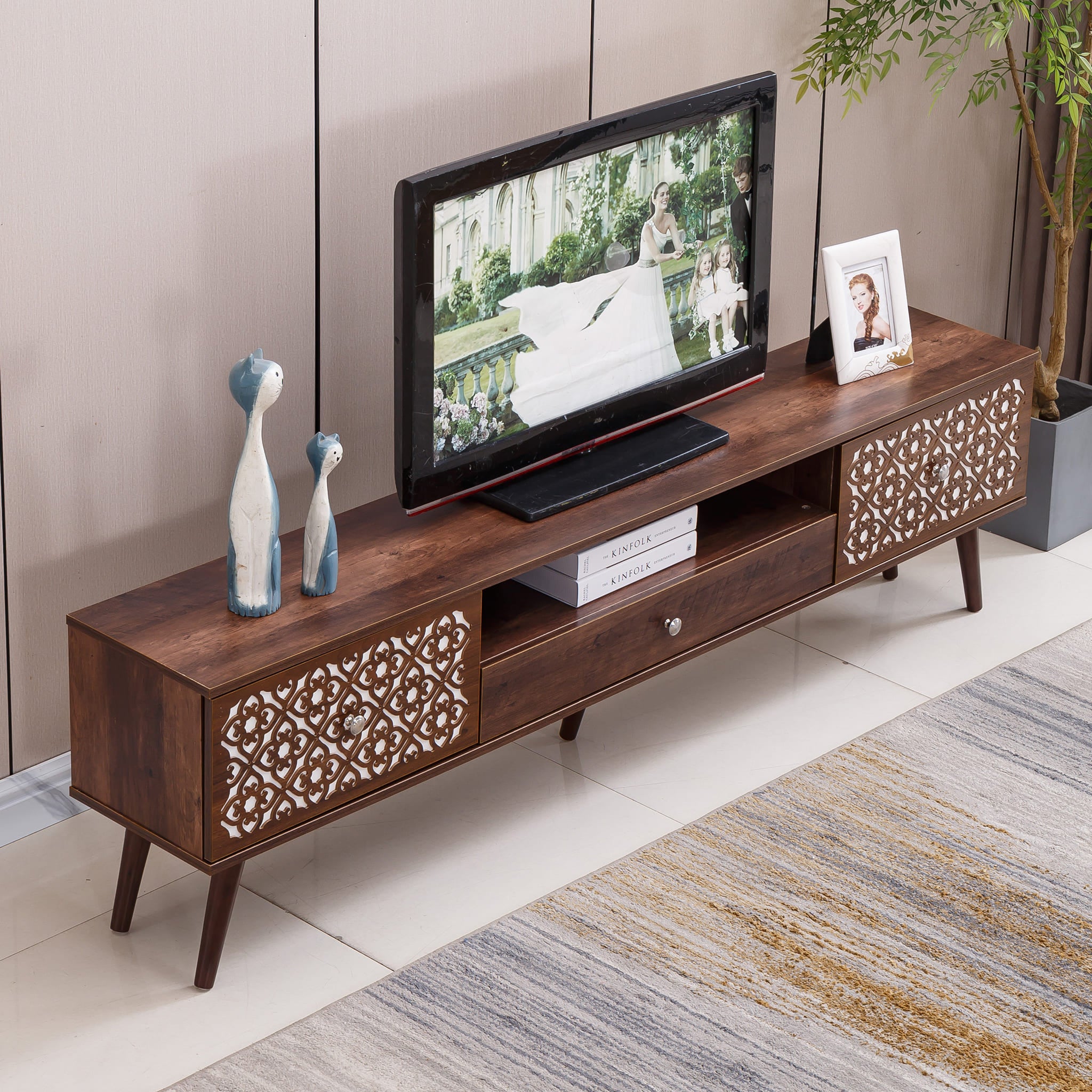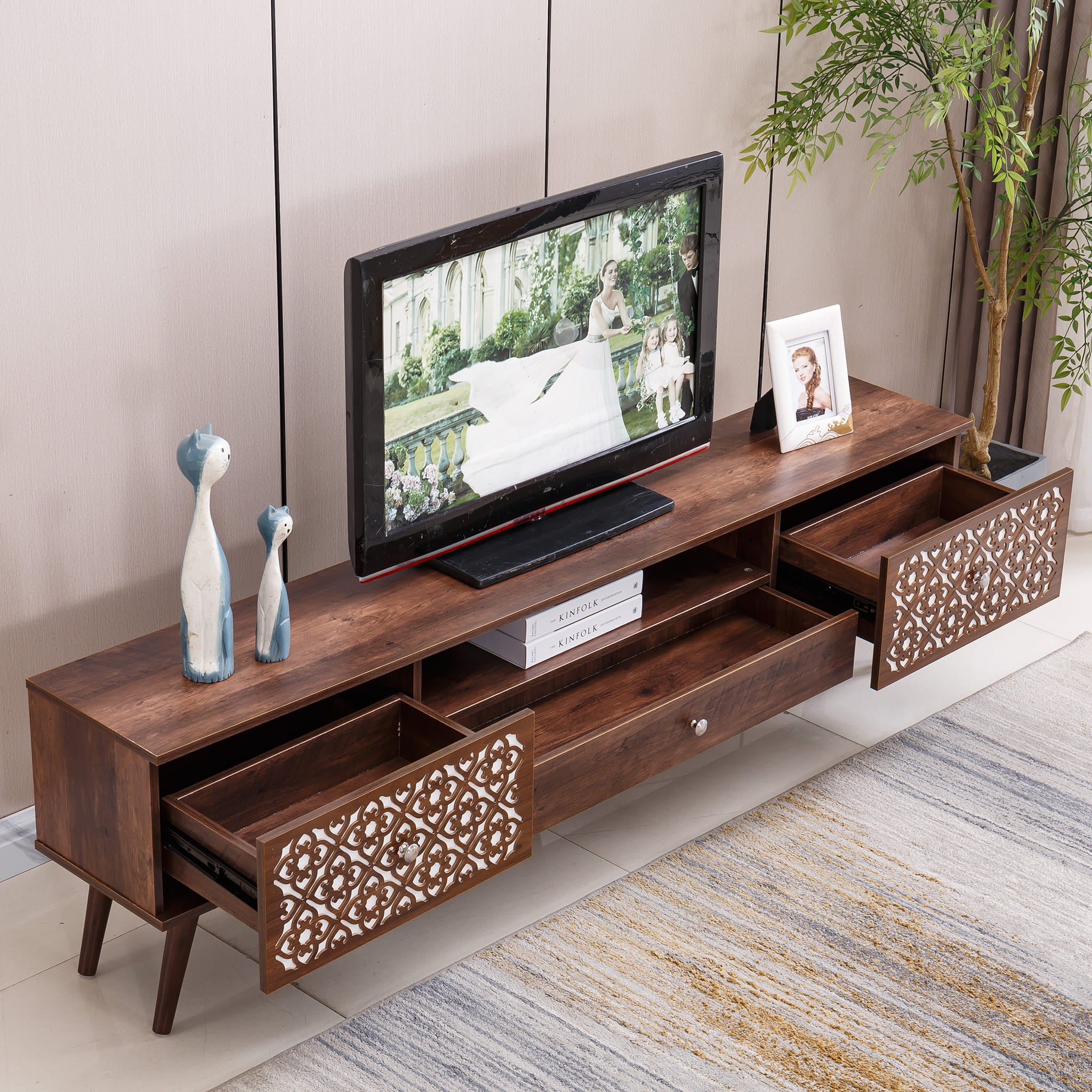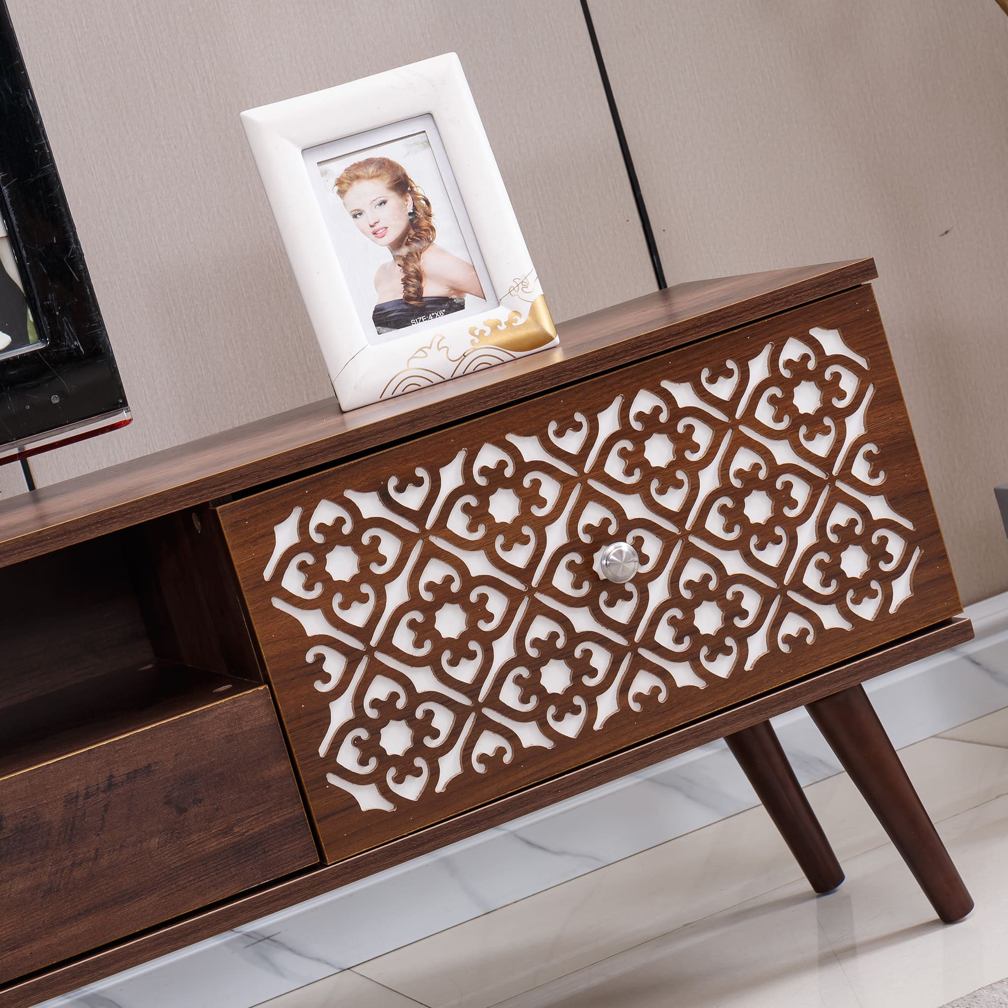 - The home furniture masterfully balances comfort and elegance, compact and spacious. Its refined design imparts a touch of sophistication to any TV area, enhancing the overall ambiance.