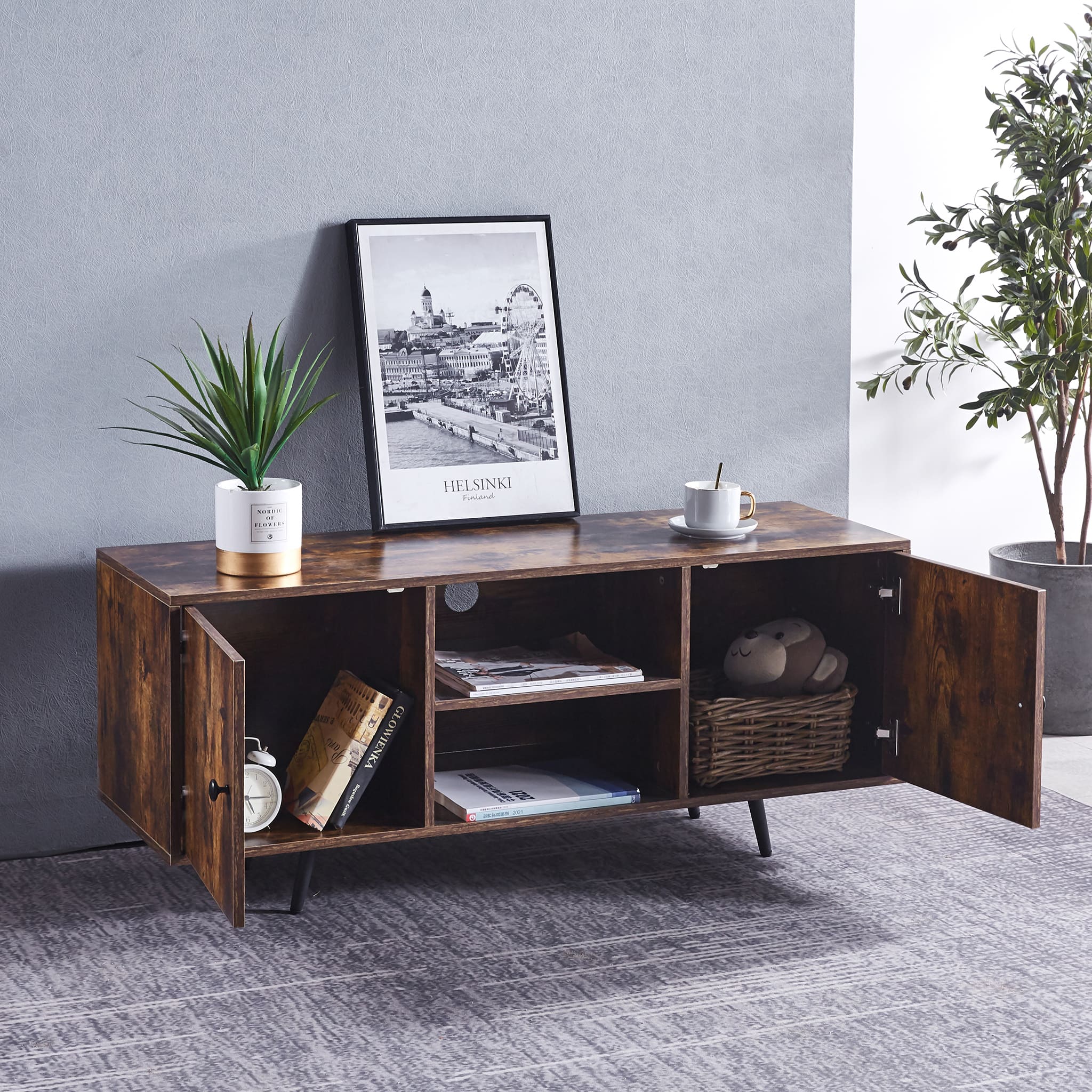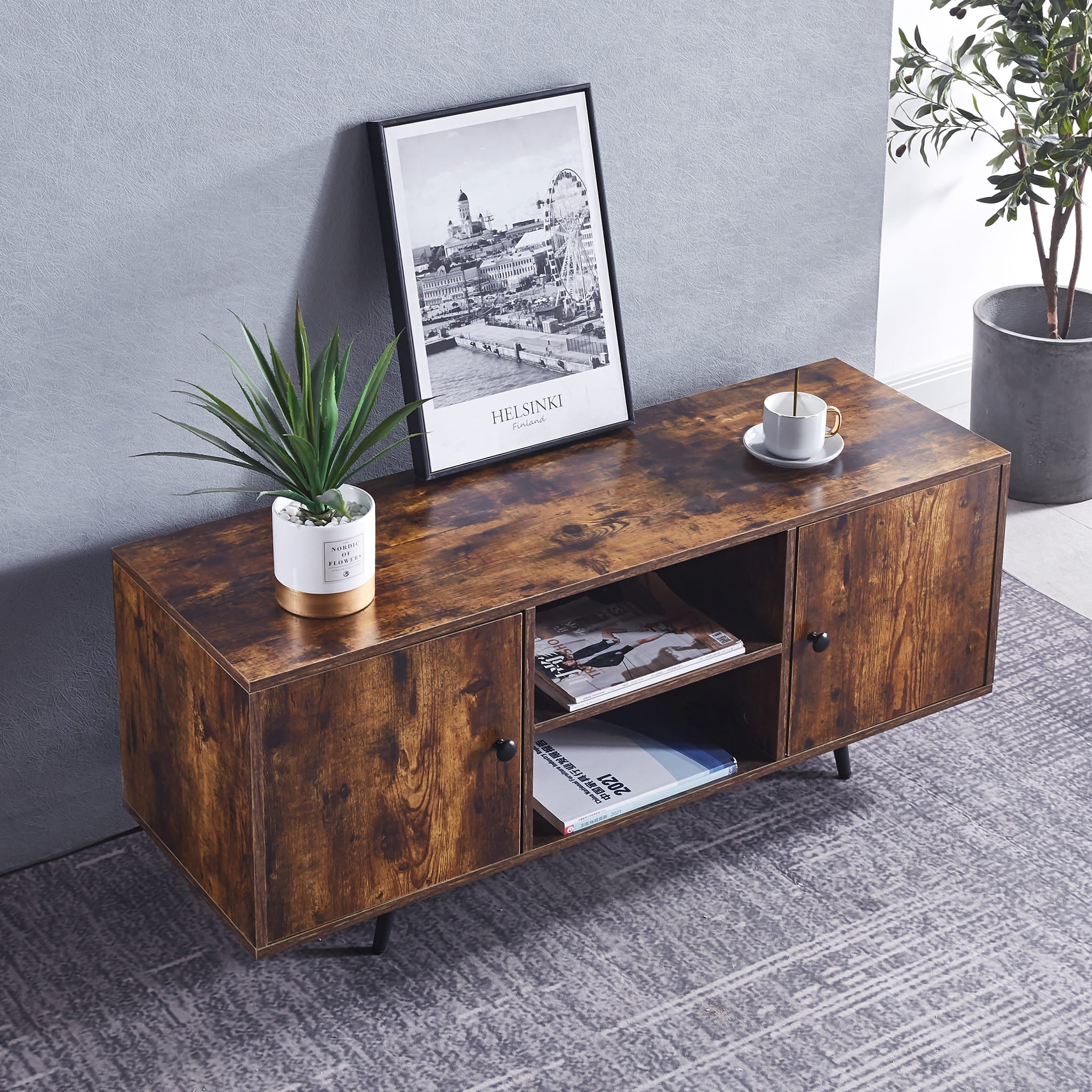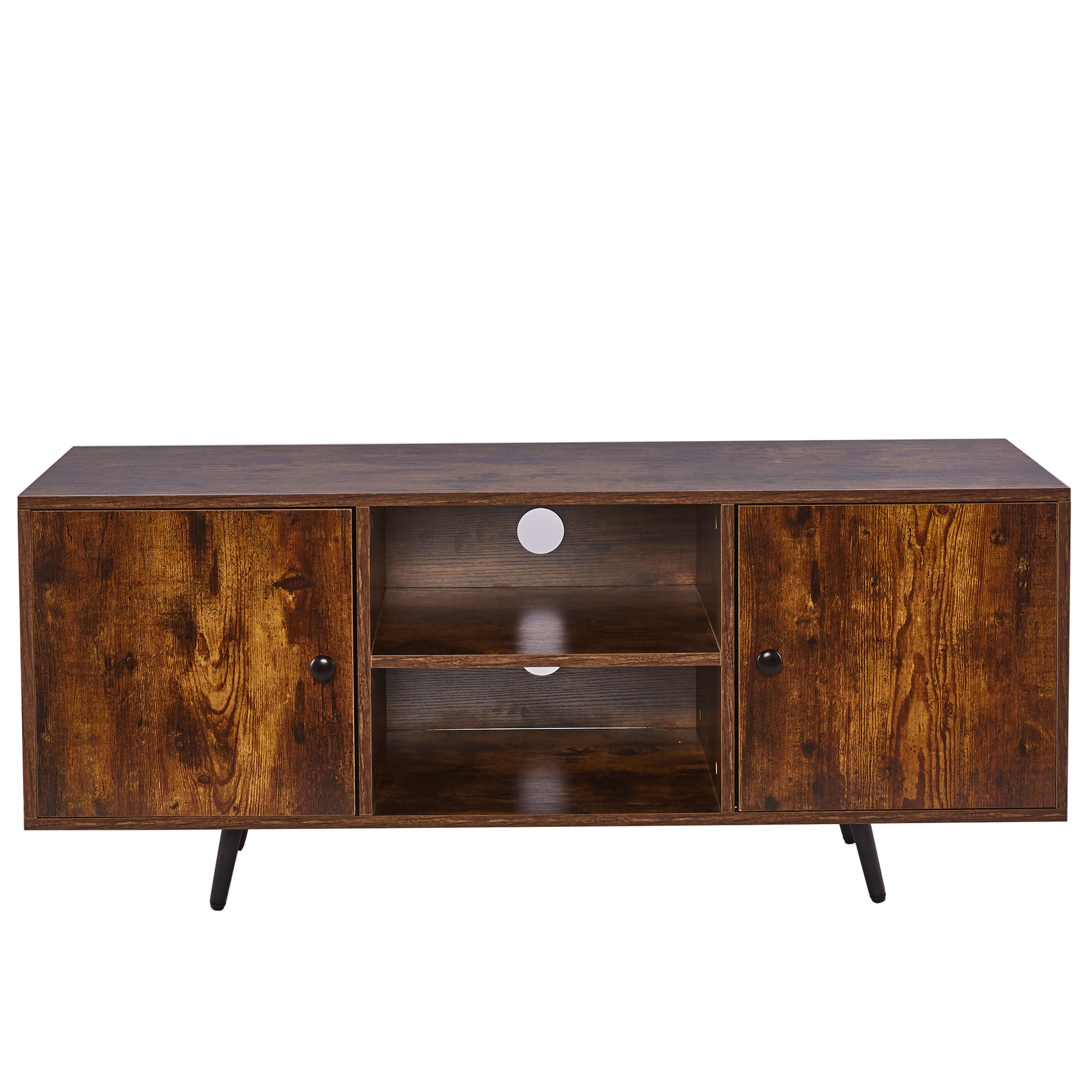 Elevate your living space with the Stapleford Rustic TV Stand, crafted from high-grade MDF with a charming rustic texture. Designed to support up to a 50'' TV, this sturdy stand features adjustable iron legs and ample storage with 2 open compartments and side cabinets. Its versatile style seamlessly blends with various decor, making it an ideal choice for any room.