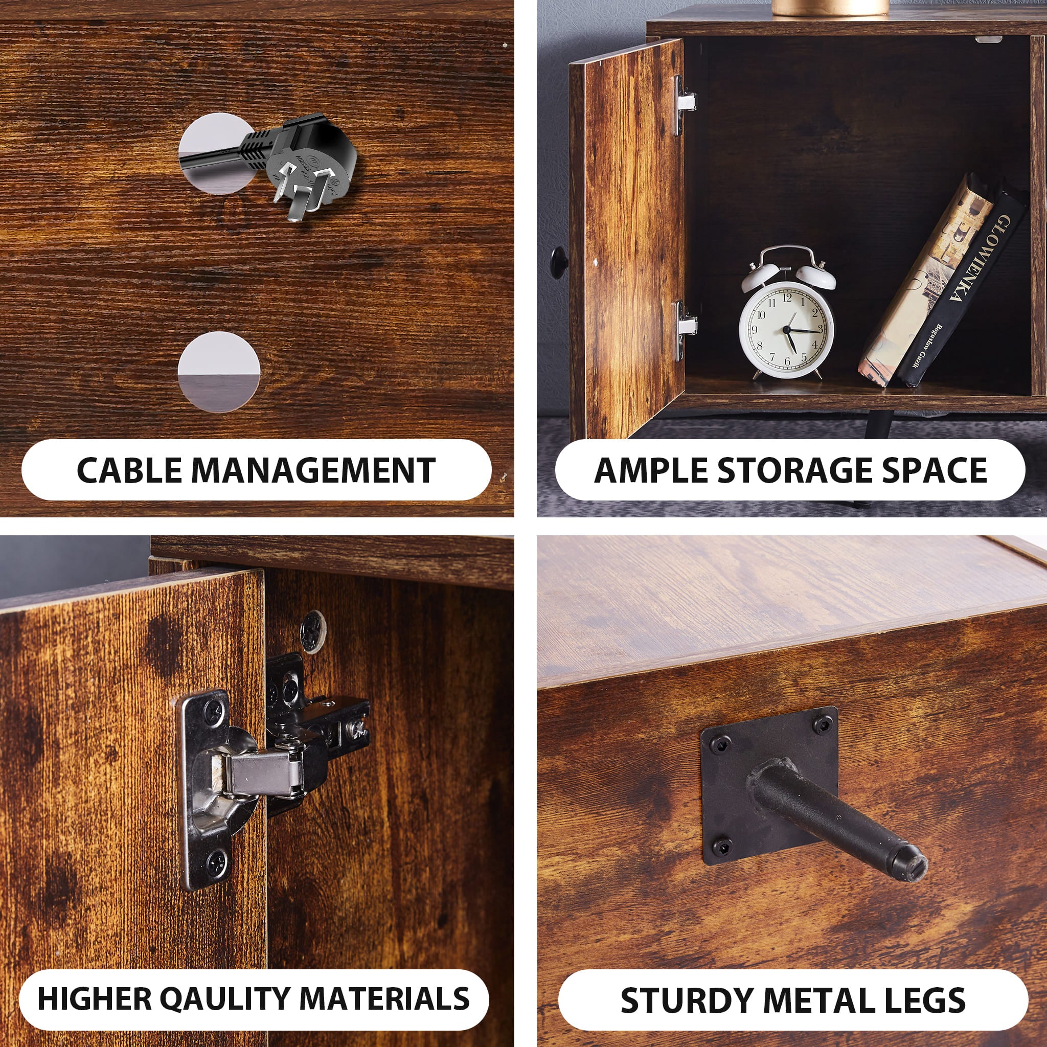 The tabletop provides spacious space to hold up to a 50'' TV. , 2 open compartments allow DVDs, books, photo albums, adornments storage, and display. The sideways cabinets are suitable for hidden storage, which not only maximizes space utilization but also stay away from dirty.
