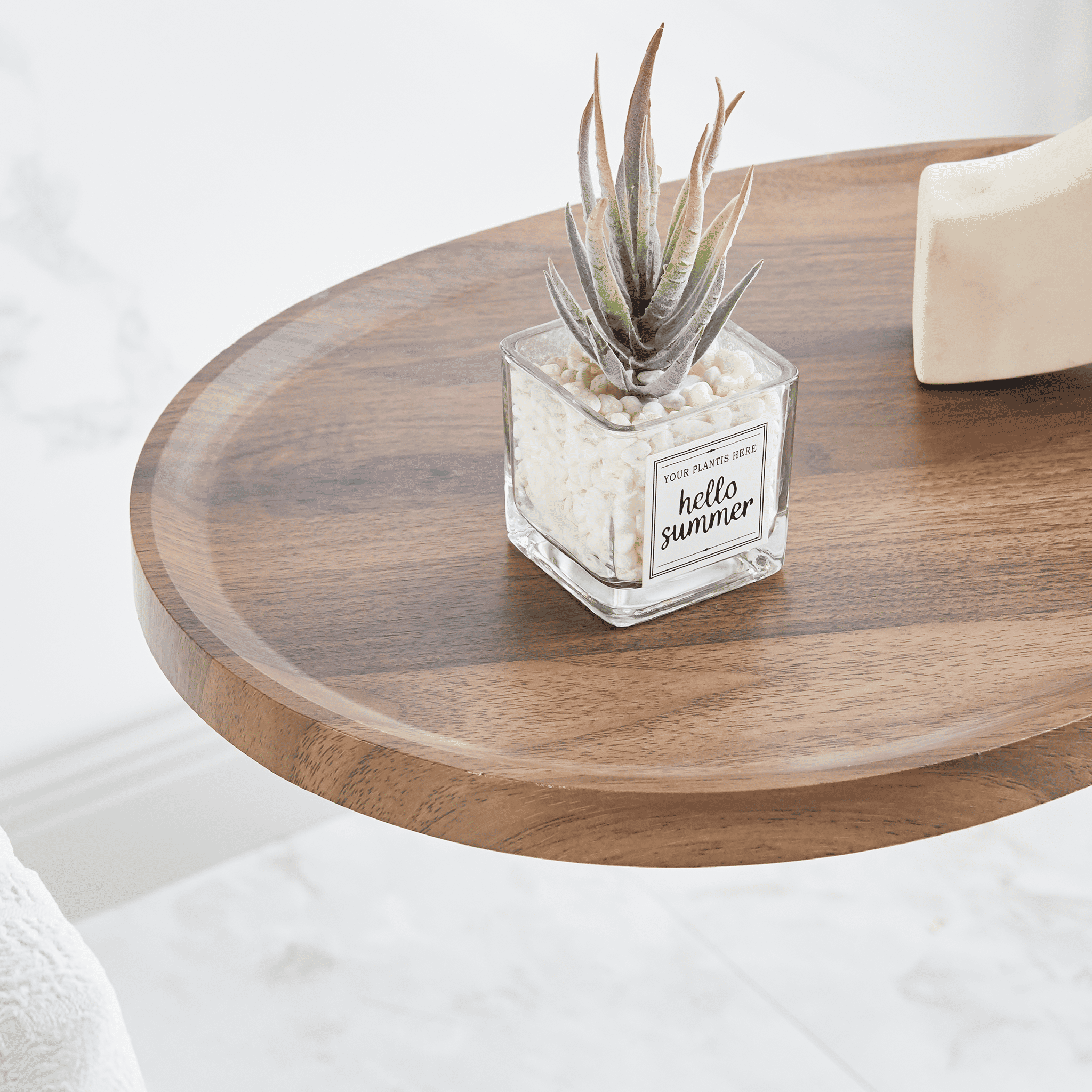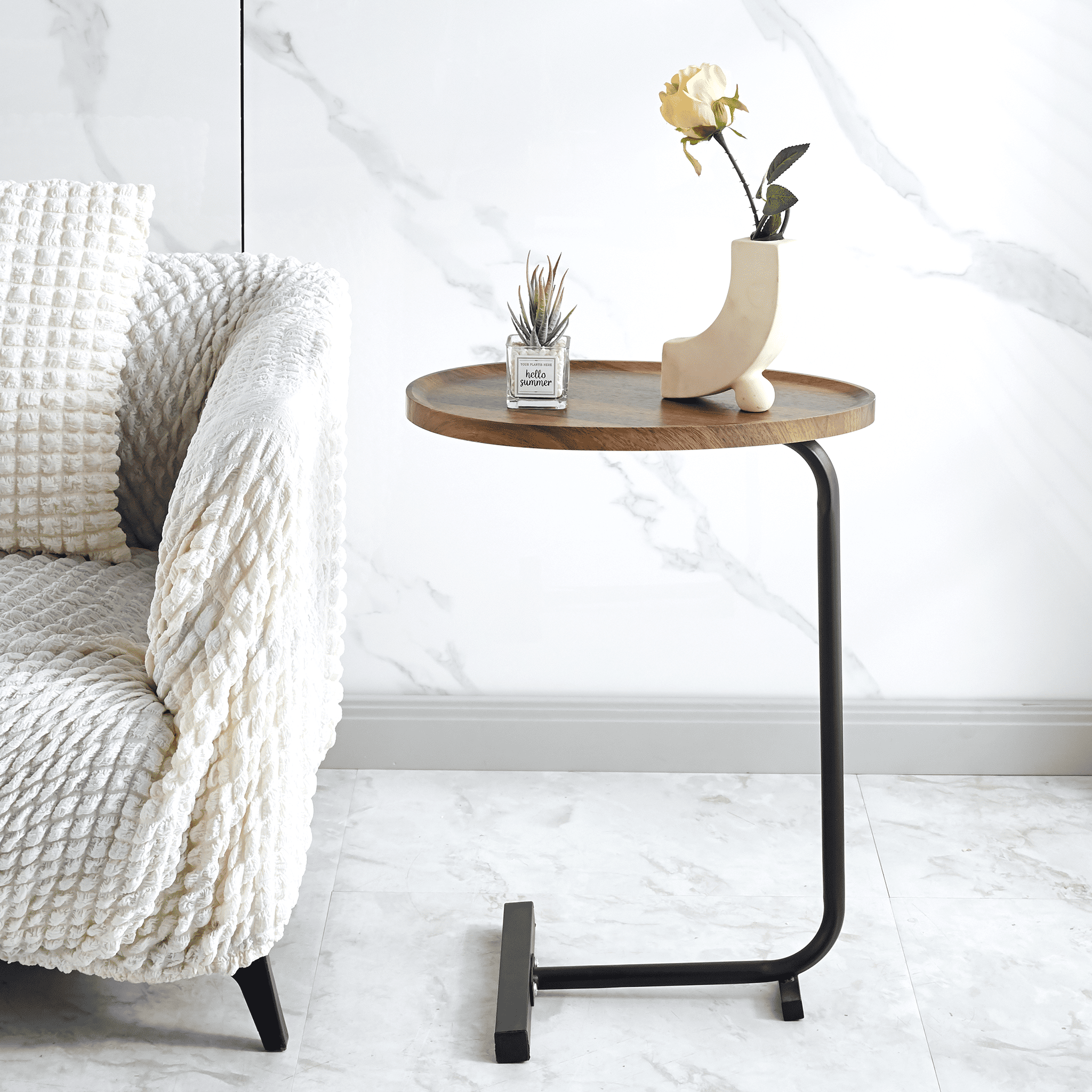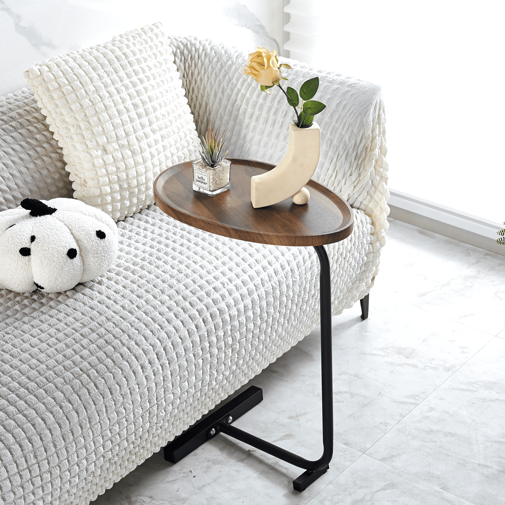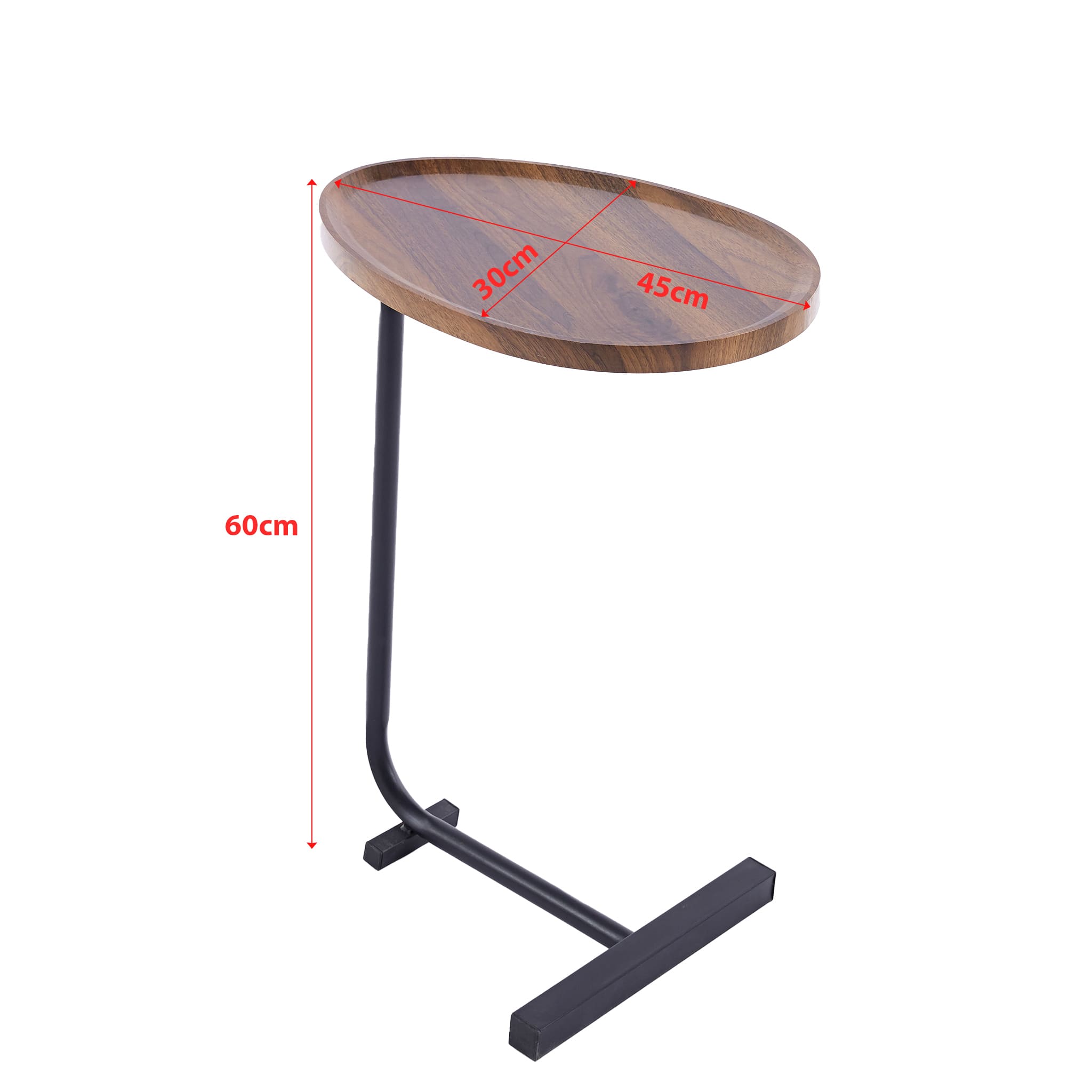 This oval side table has a delicate and unique design and simple structure, the edge is raised to prevent items from slipping off at will.